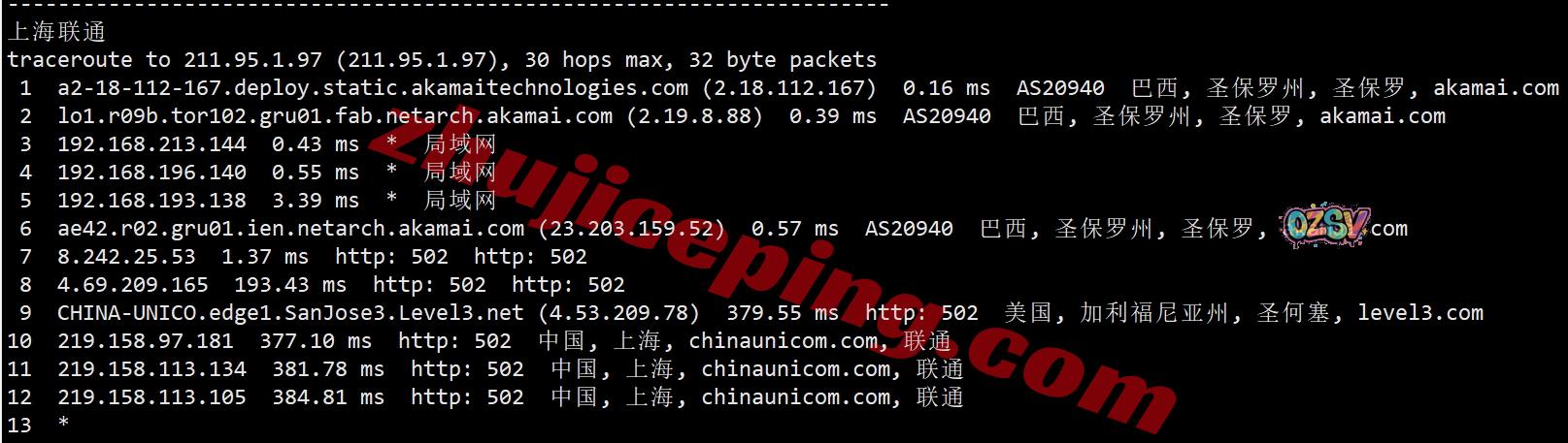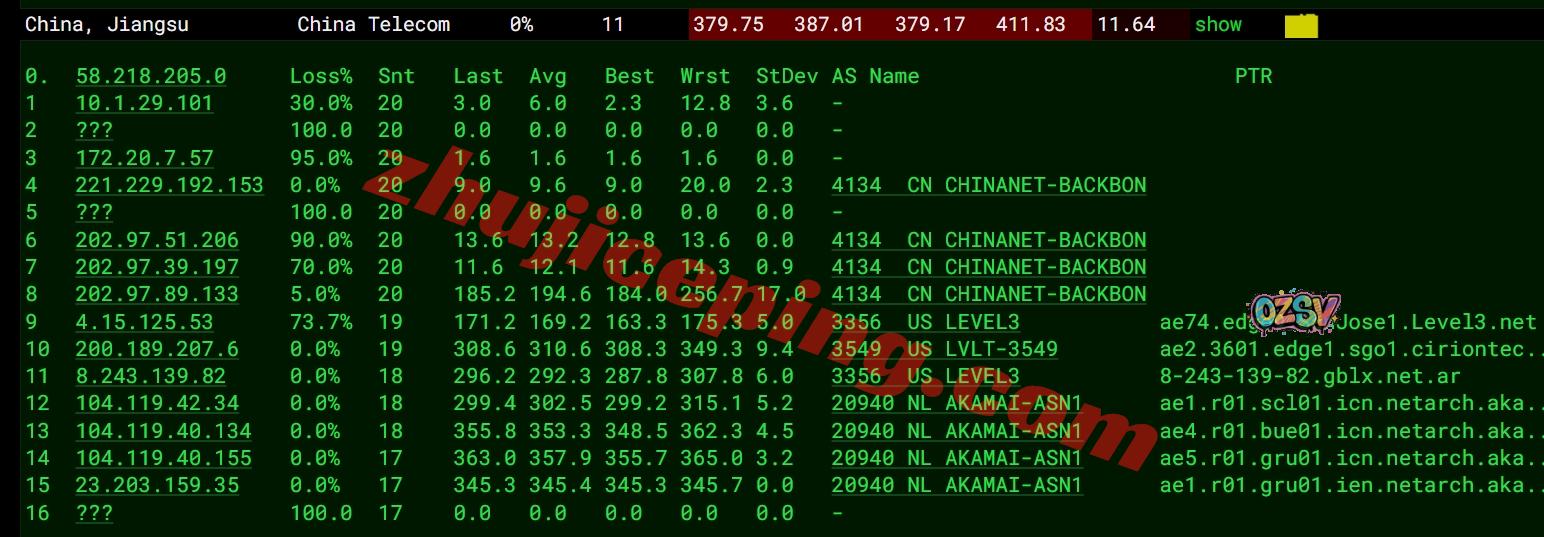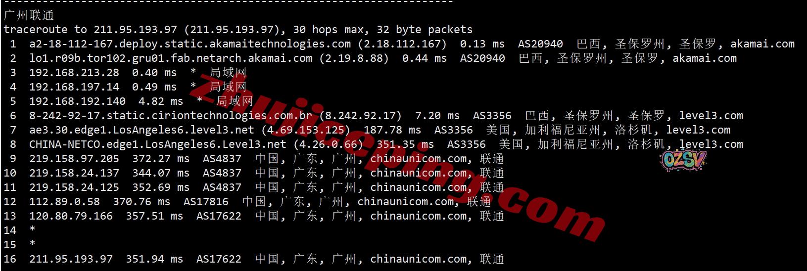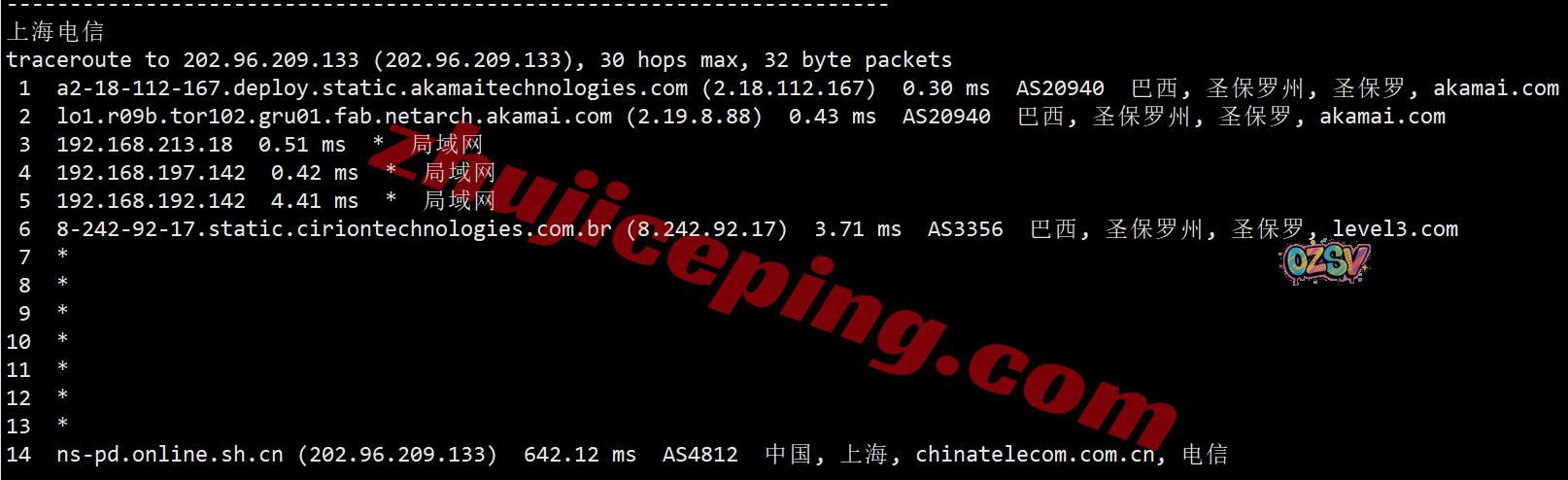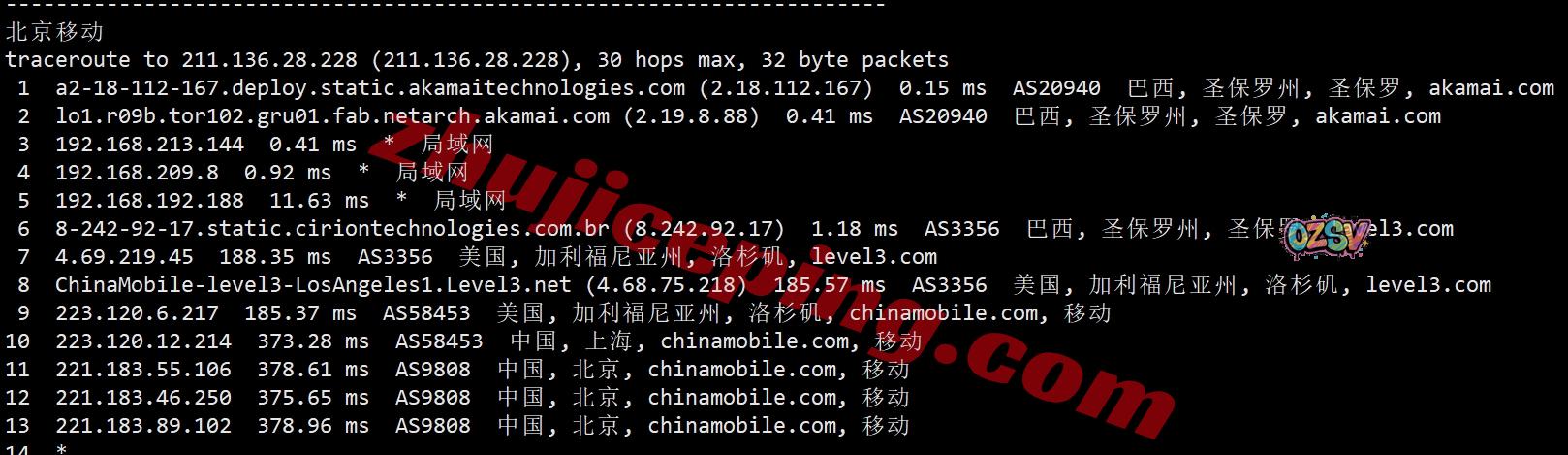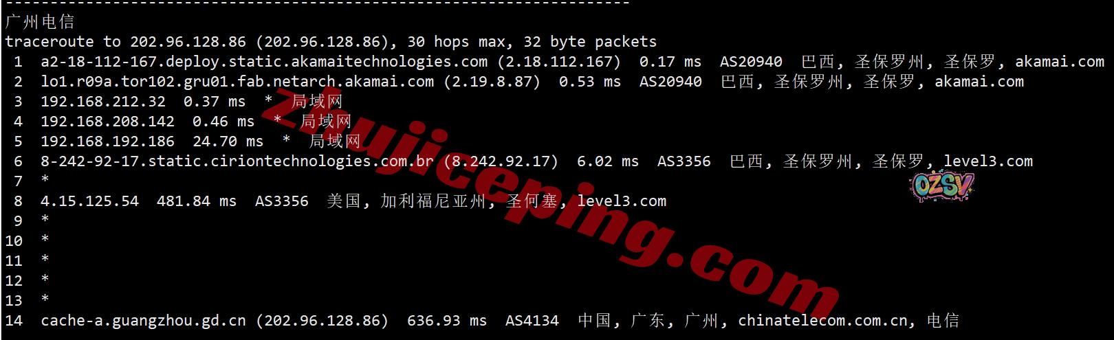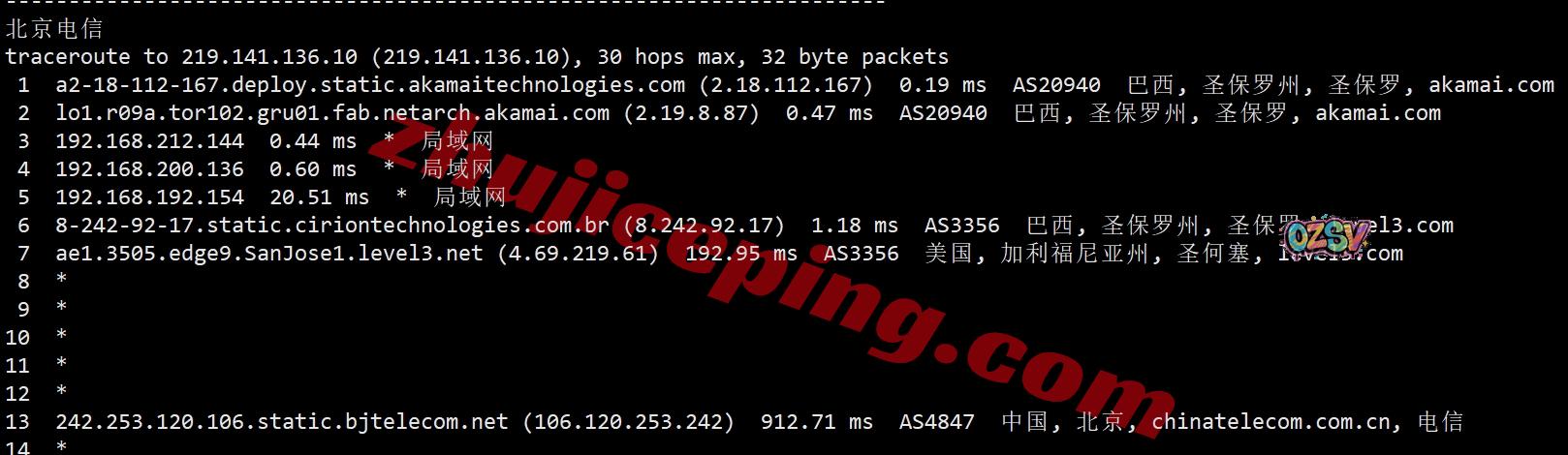 电信去程:直连电信圣何塞节点,然后走level3经过akamai自己的网络去巴西