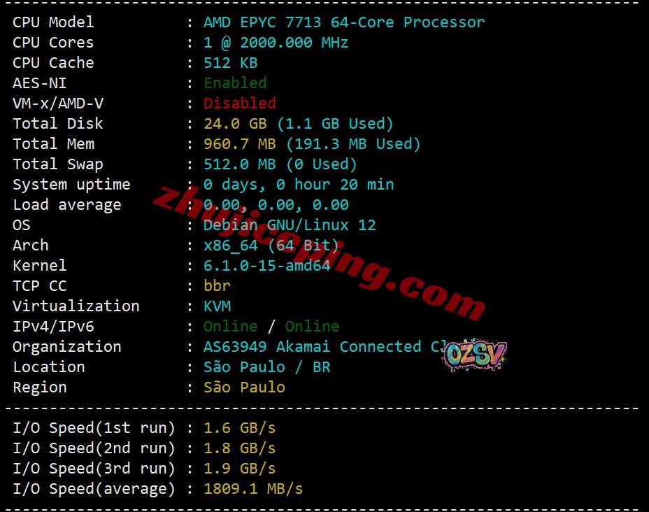 AMD EPYC 7713(64核、128线程、主频2.0GHz、加速频率3.675GHz),站长启用了BBR,支持IPv6,IP归属巴西圣保罗,当前硬盘I/O大致1809MB/S:
