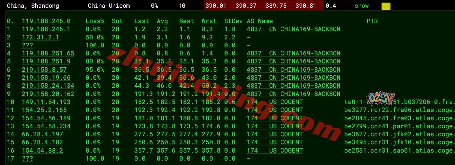 联通去程:直连德国法兰克福联通节点,然后走cogent经过法国、美国纽约然后去巴西