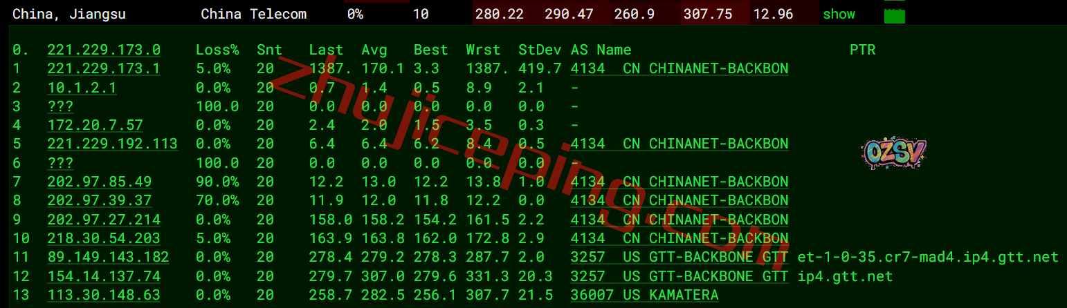 电信去程:骨干网直连电信美国圣何塞节点,然后走GTT去西班牙马德里
