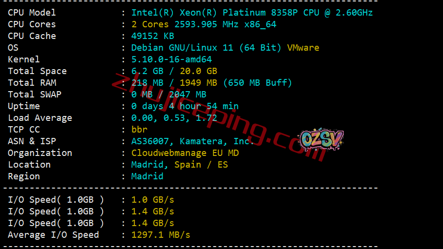 CPU为Intel Xeon Platinum 8358P(2021年2季度出厂,32核、64线程,主频2.6GHz\加速频率3.4GHz),启用了BBR,自己的ASN,归属西班牙马德里,当前I/O大致1297MB/S: