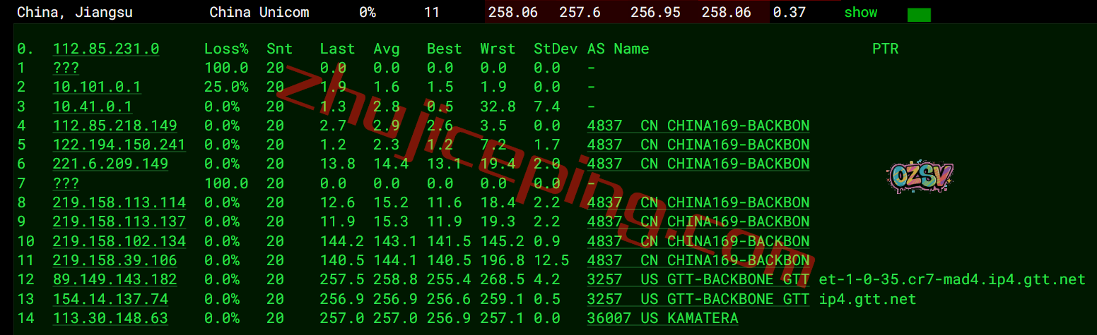 联通去程:骨干网直连联通美国圣何塞节点然后走GTT去西班牙马德里