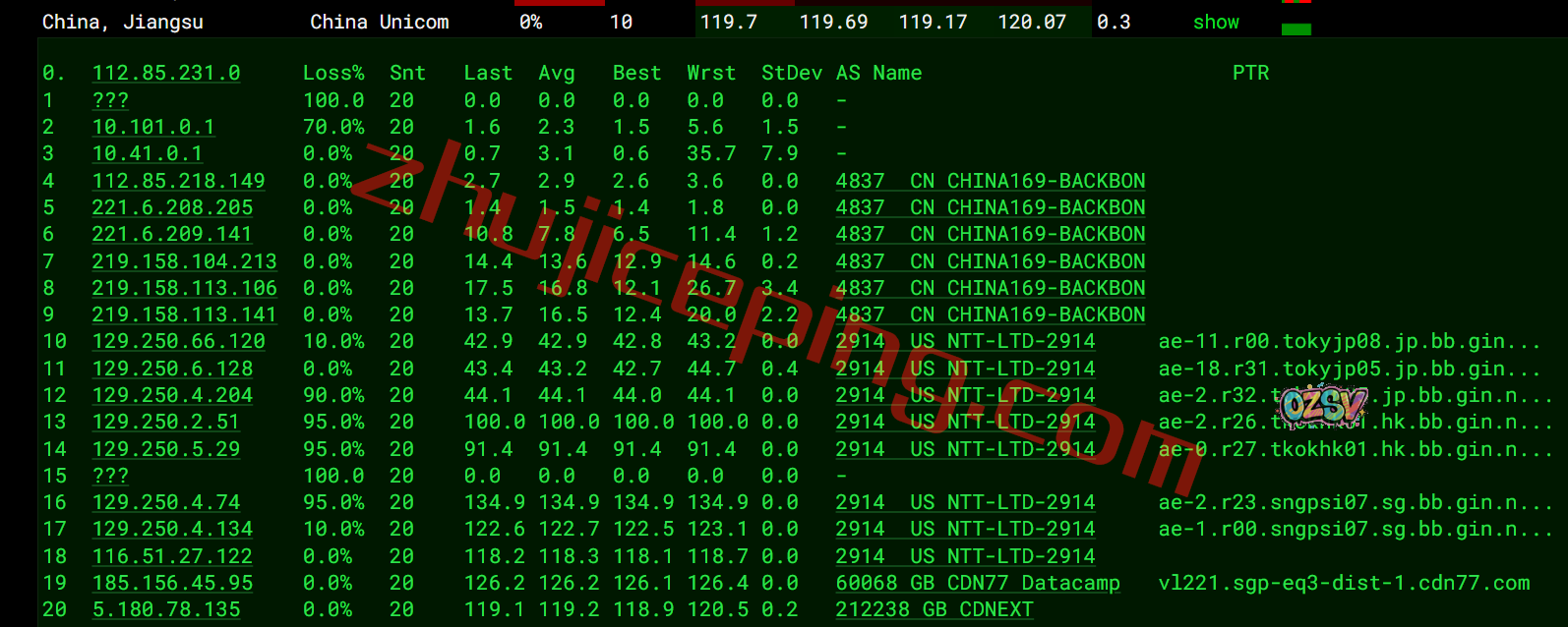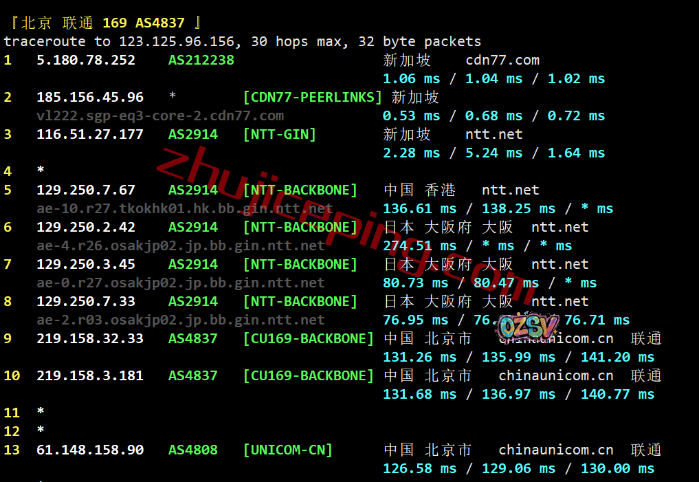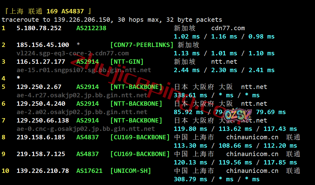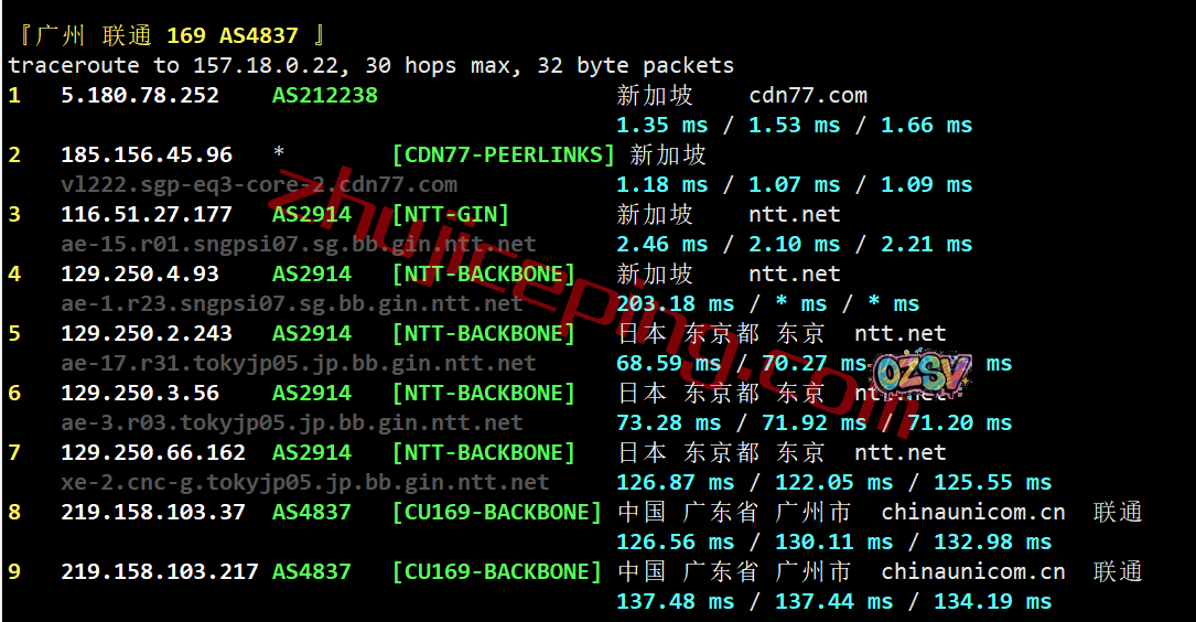 联通去程:骨干网对接NTT先去日本然后从香港去新加坡