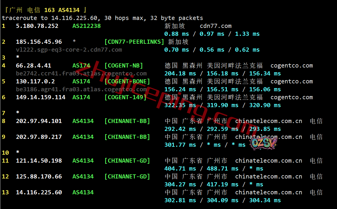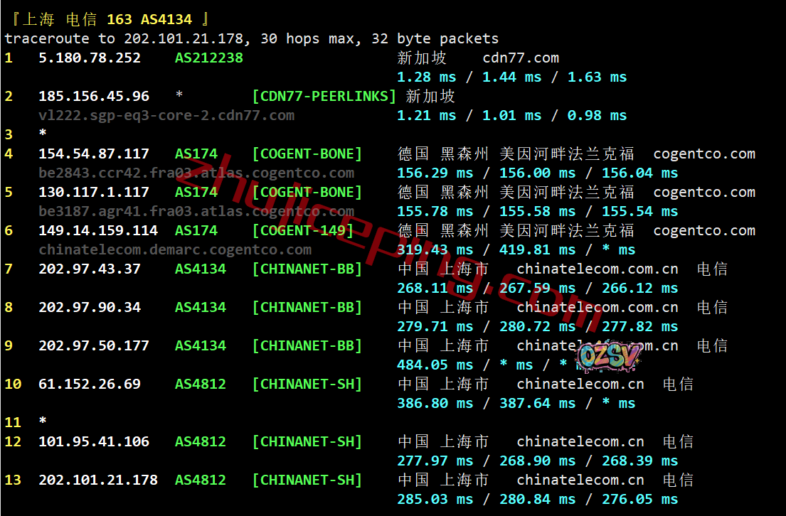 上海方向:上海/广州方向:走cogent去德国,从电信与cogent在法兰克福的peer出来回国