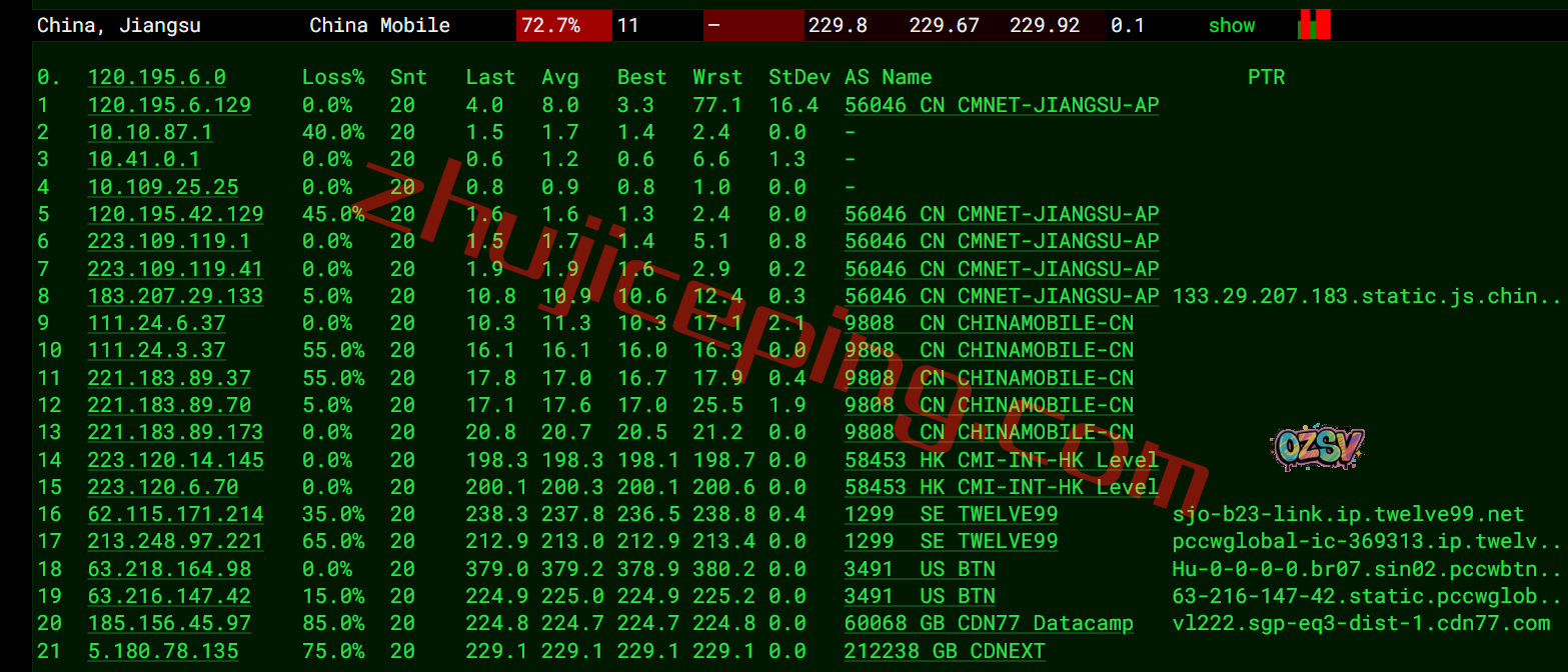 移动去程:直连移动美国圣何塞节点然后走twelve99转PCCW去新加坡