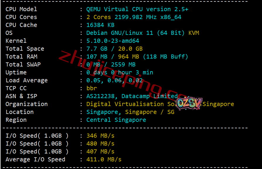 CPU型号未知,主频2.2GHz,启用了BBR,ASN是datacamp的,归属地新加坡,当前硬盘I/O大致411MB/S: