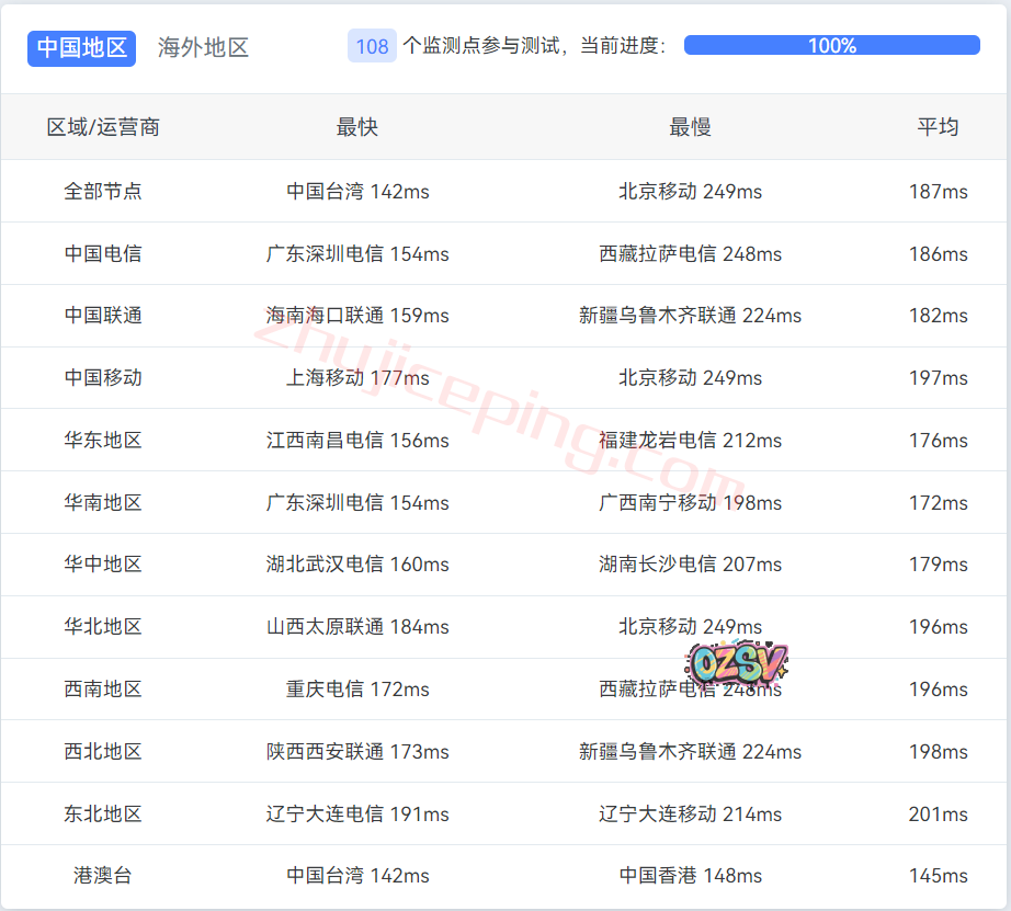 国内三网多节点的延迟测试数据: