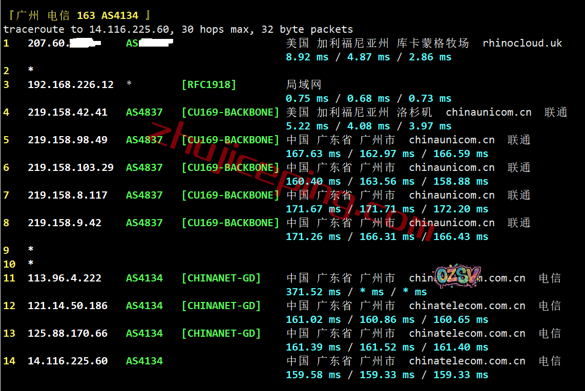 电信去程:直连,隐藏了部分路由