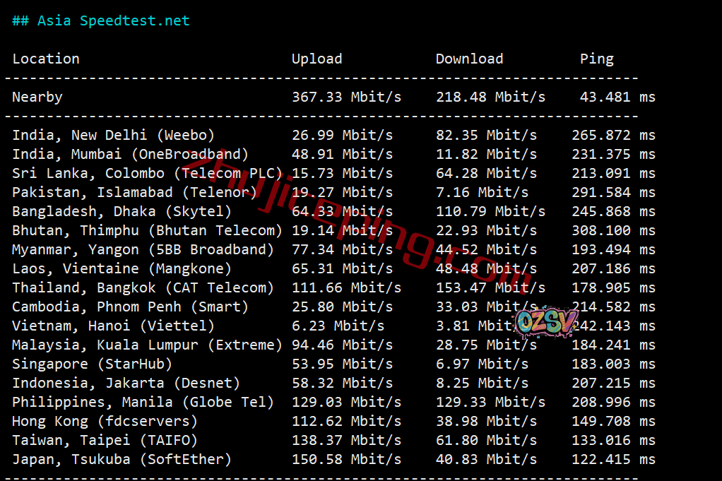 speedtest的部分亚洲区域内的节点的测试: