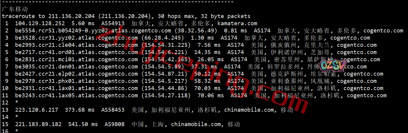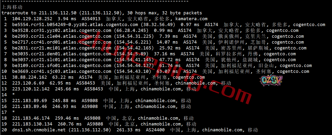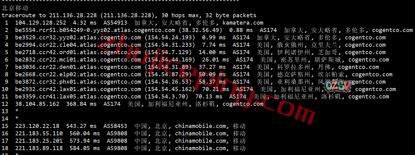 移动回程:走cogent从加拿大经过美国境内最后从洛杉矶或者圣何塞出海回国,其中上海和广州方向都是从西海岸移动节点直连出海的
