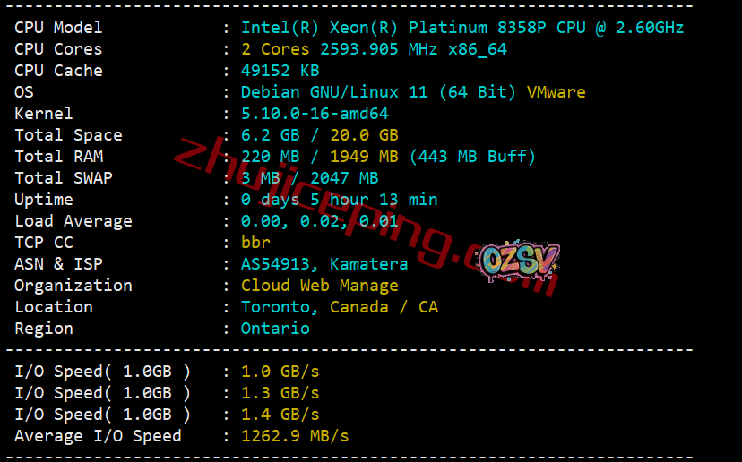 CPU为Intel Xeon Platinum 8358P(2021年2季度出厂,32核、64线程,主频2.6GHz\加速频率3.4GHz),启用了BBR,自己的ASN,归属加拿大多伦多,当前I/O大致1262MB/S: