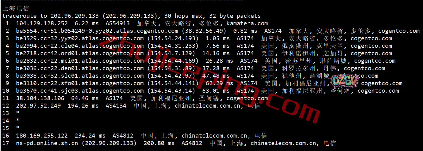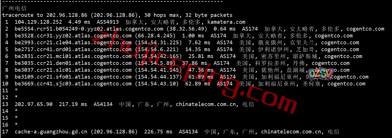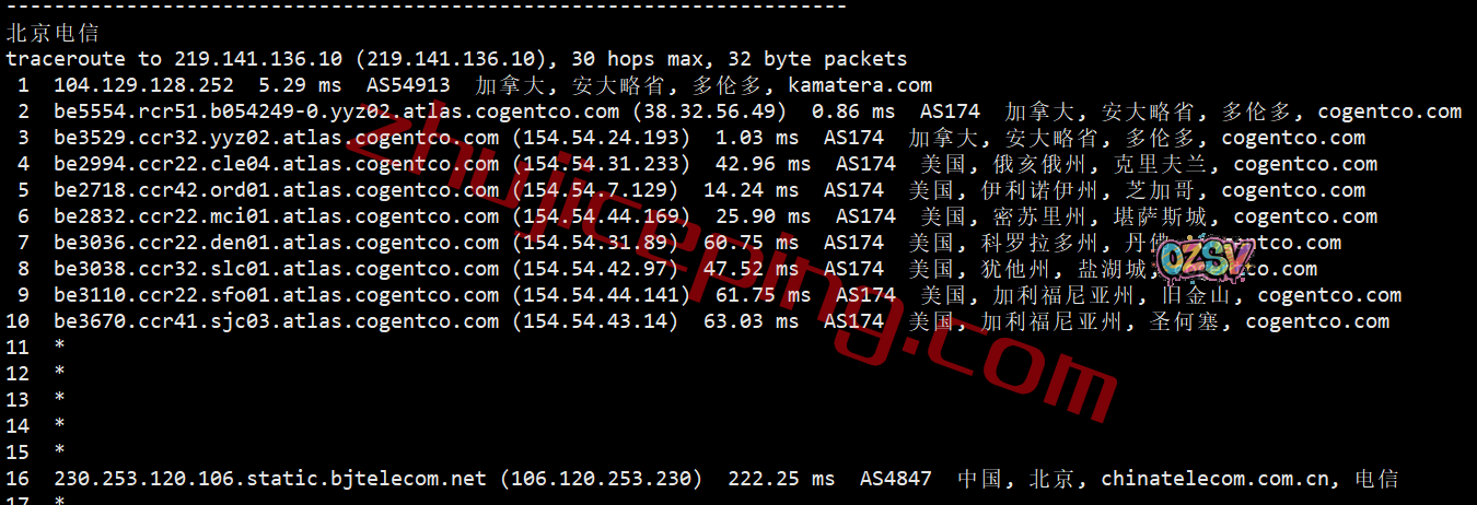 电信回程:从加拿大走cogent在美国过了一大堆地方最后从圣何塞出海回国