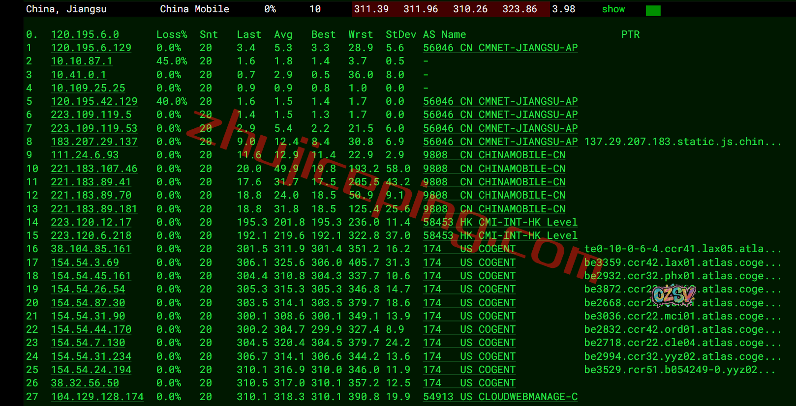 移动去程:直连移动美国洛杉矶节点然后走cogent在美国绕了一大圈再去加拿大