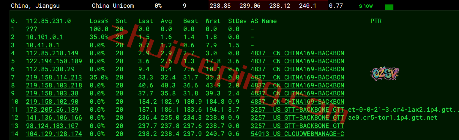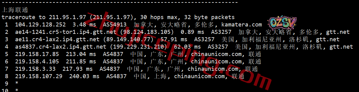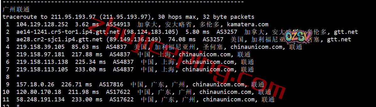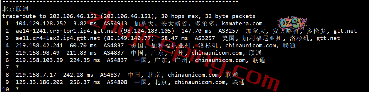 联通去程:直连联通美国洛杉矶节点,然后走GTT去加拿大
