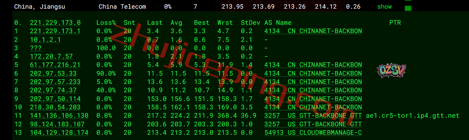 电信去程:直连电信美国圣何塞节点然后走GTT去加拿大