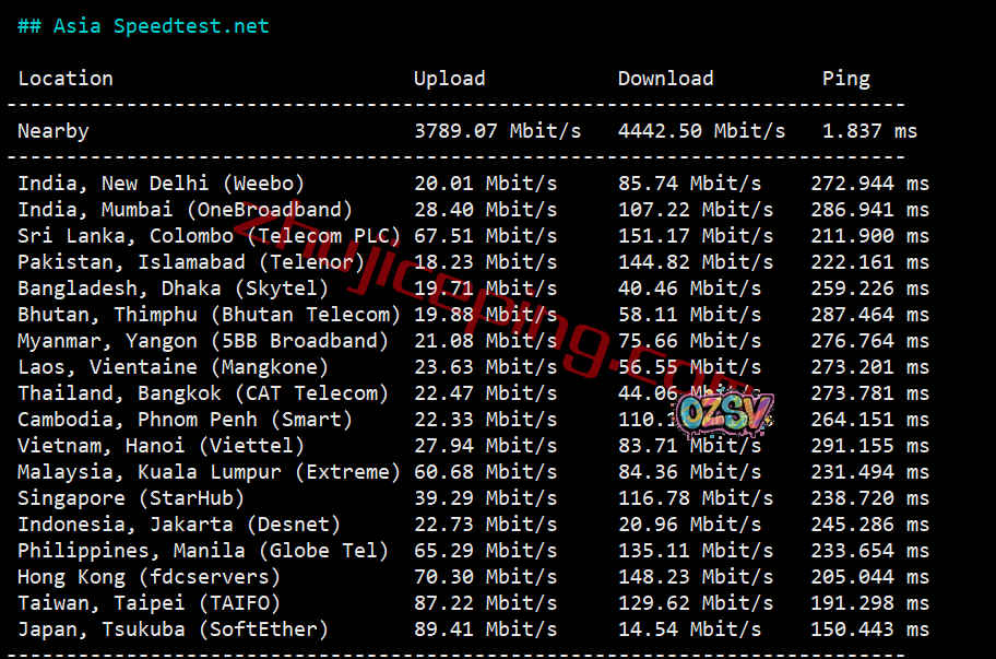 speedtest的部分亚洲区域内的节点的测试: