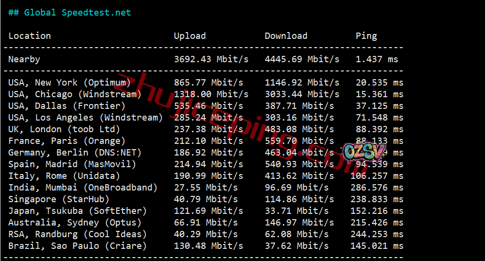 再看看speedtest的部分国际节点的测试数据: