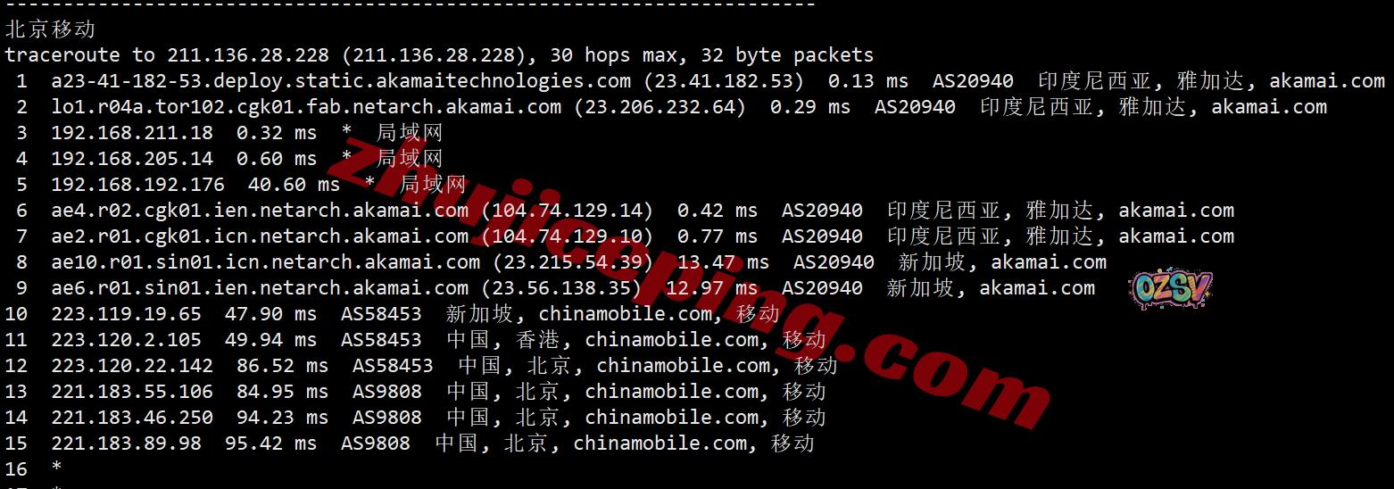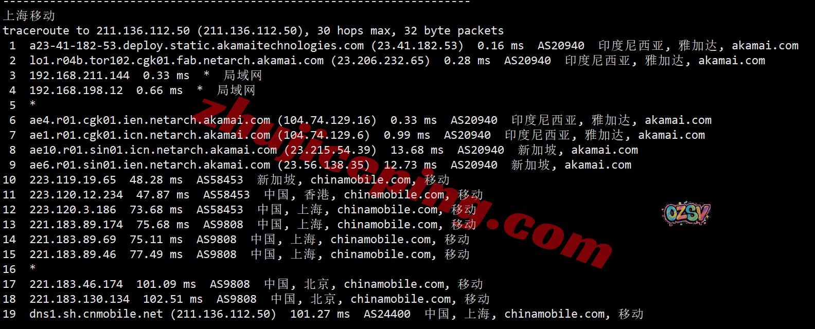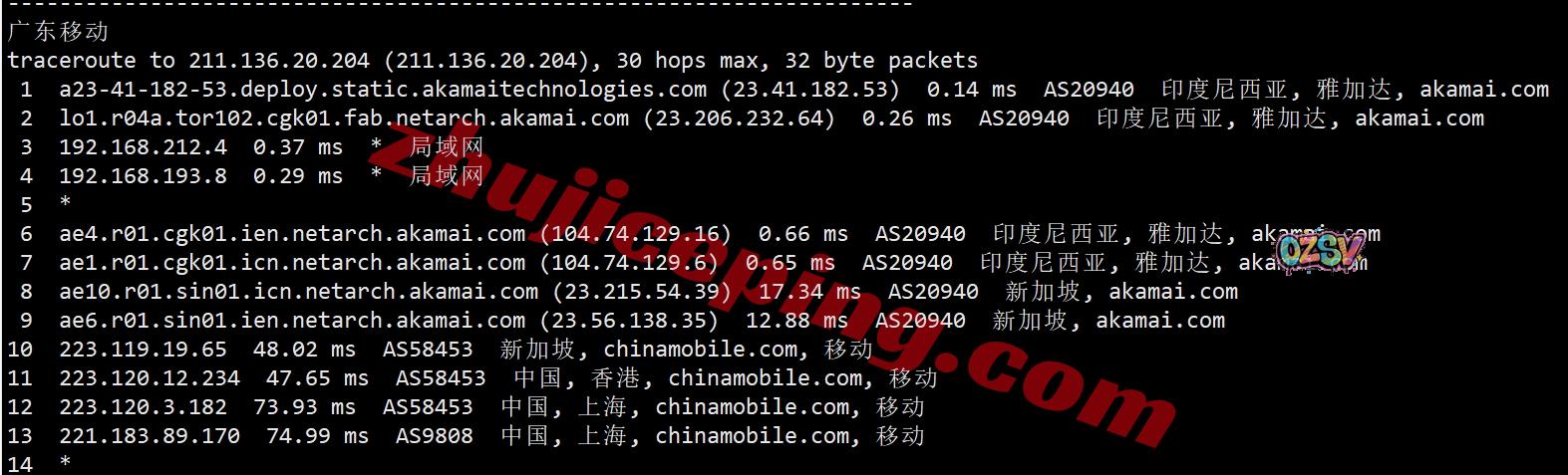 移动去程:走CMI经过香港转PCCW再接akamai香港内网去新加坡然后去印尼
