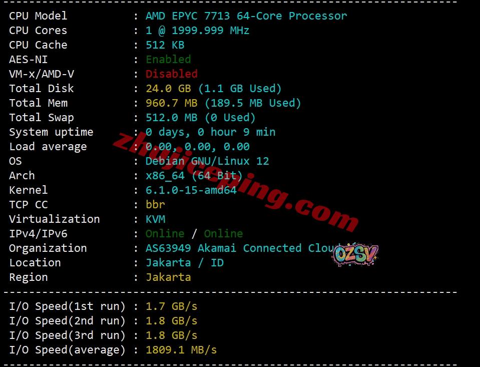 AMD EPYC 7713(64核、128线程、主频2.0GHz、加速频率3.675GHz),站长启用了BBR,支持IPv6,IP归属印尼雅加达,当前硬盘I/O大致1809MB/S: