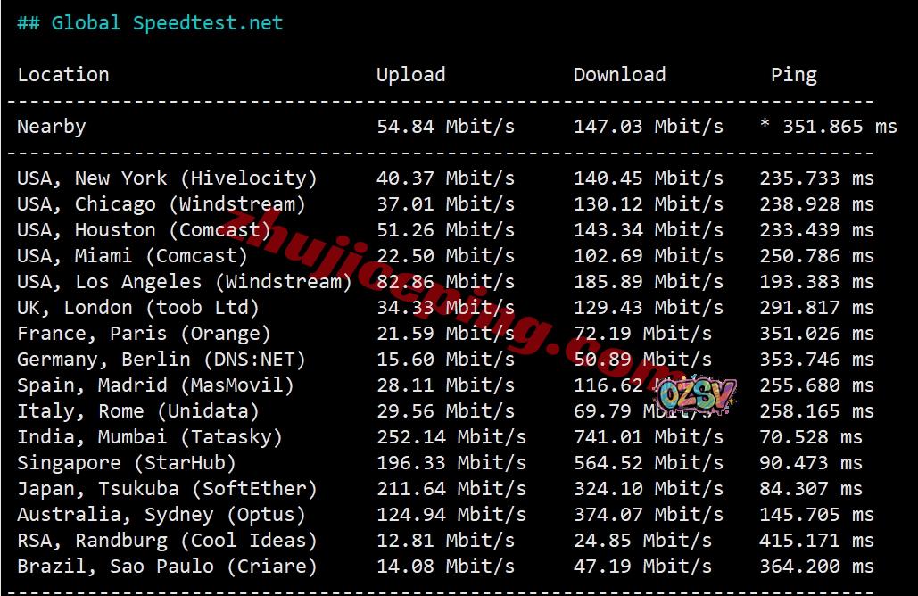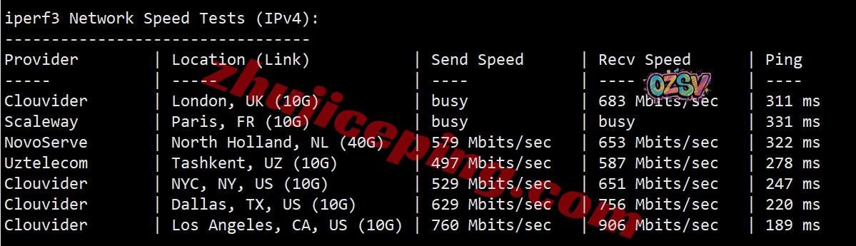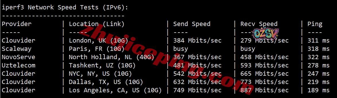 iperf3,IPv6环境下,几个欧美节点的测试数据: