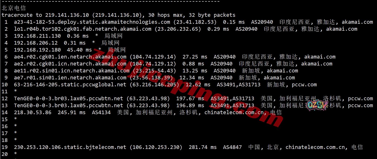 北京方向:akamai内网经过新加坡后转pccw去美国洛杉矶,然后从电信洛杉矶节点直连回国