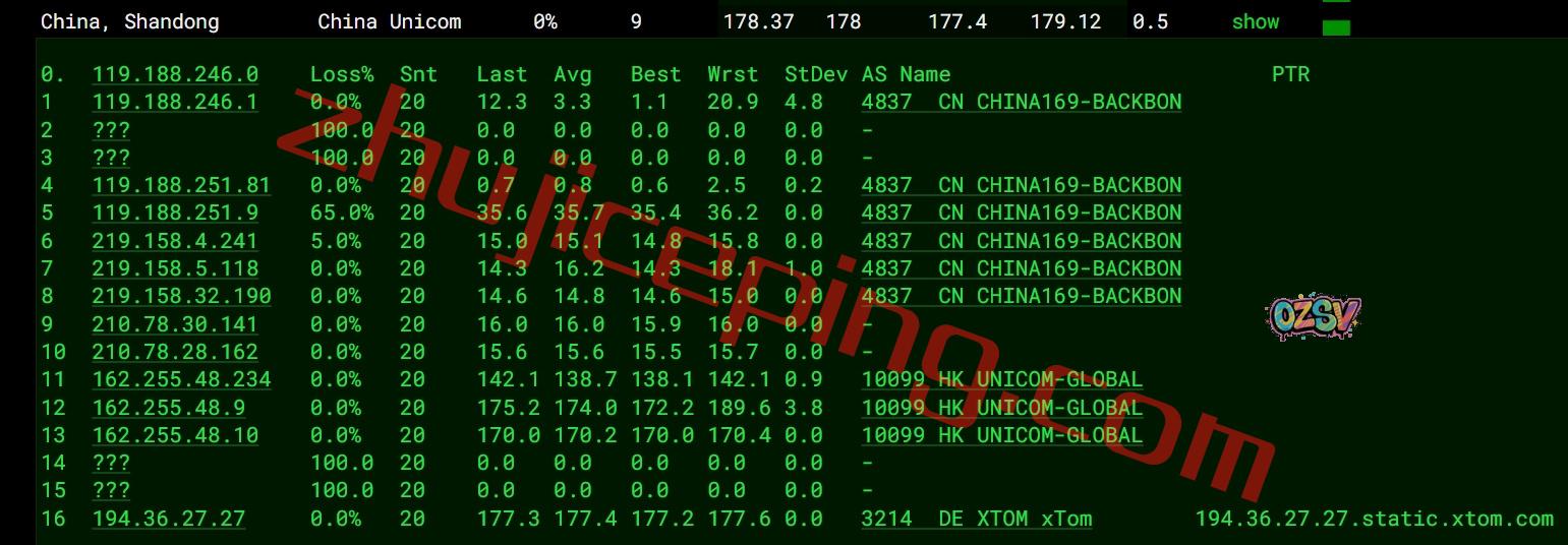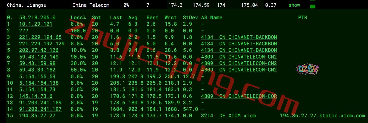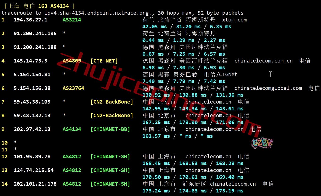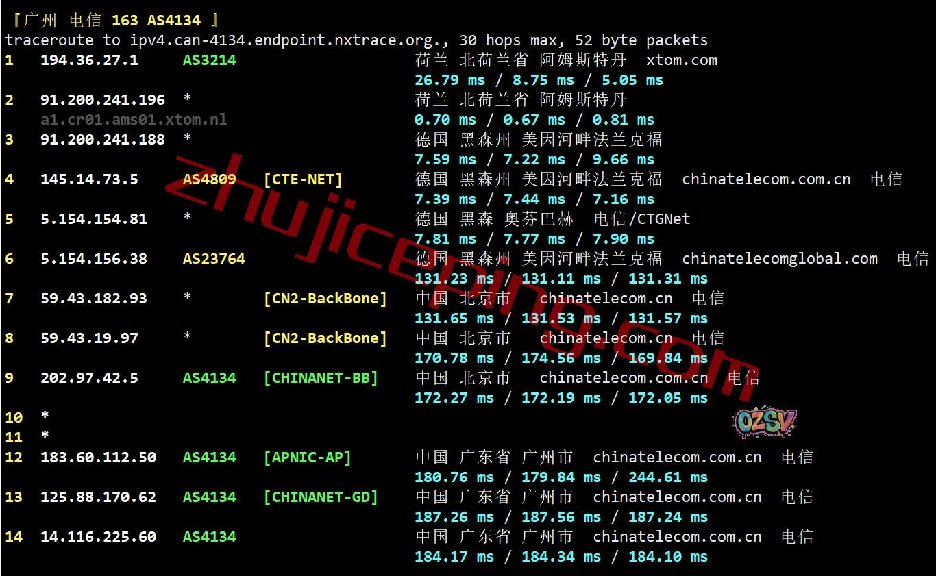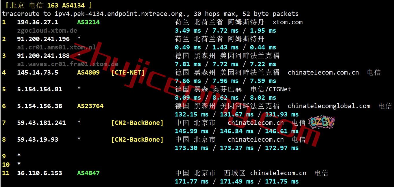 电信回程:荷兰到德国,走的是XTOM自己的网络,然后从电信德国节点走CN2回国