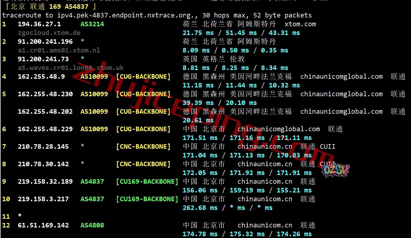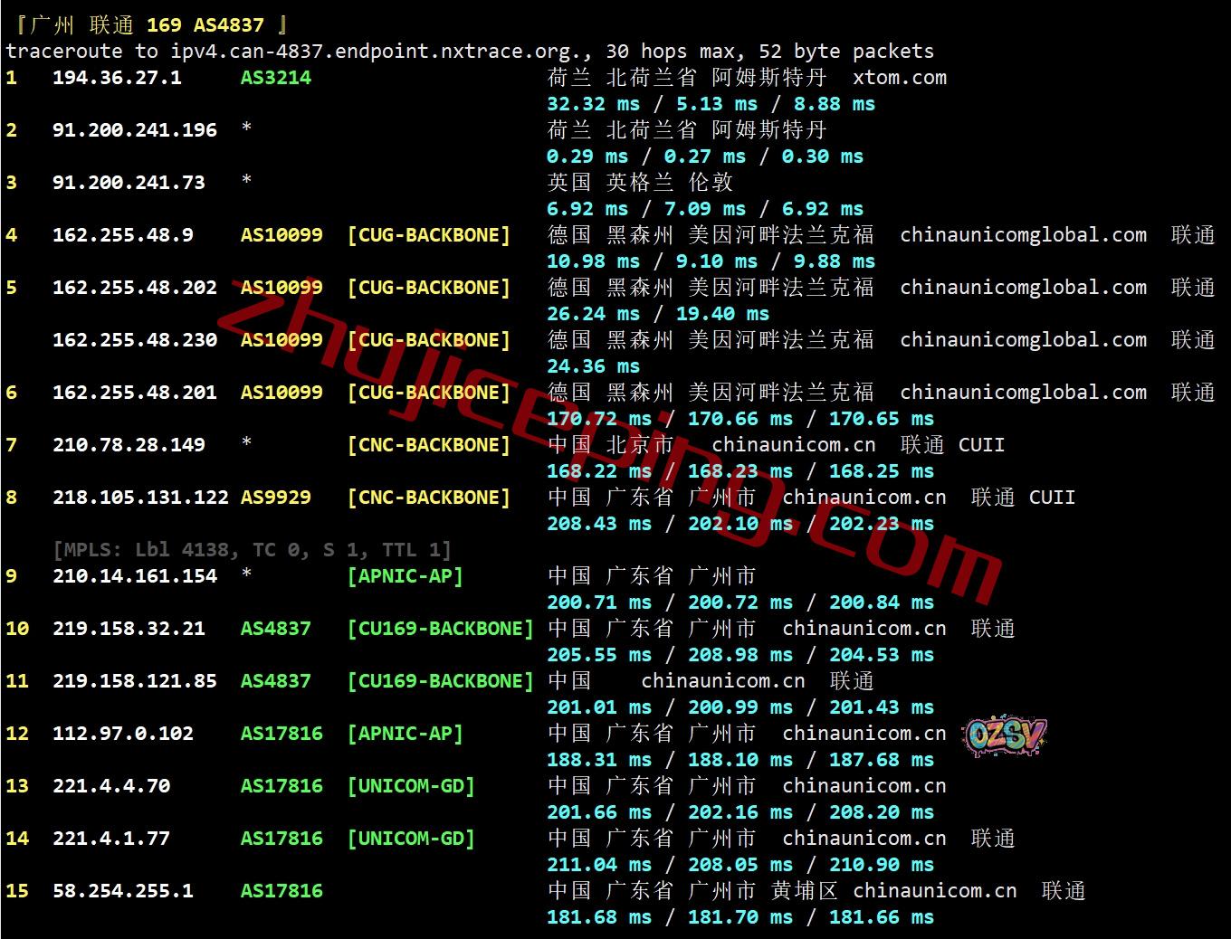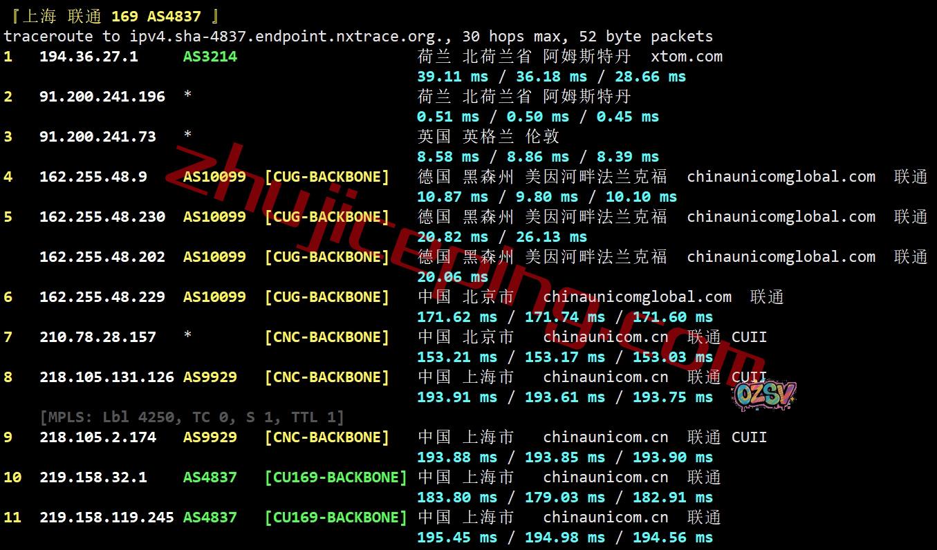 联通去程:AS4837+AS9929+AS10099直达英国,然后去荷兰