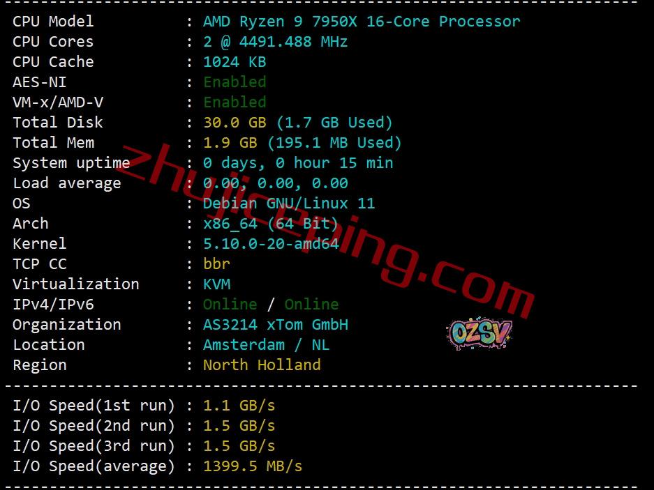AMD Ryzen 9 7950X(16核、32线程、主频4.5GHz、加速频率5.7GHz),开启BBR,支持IPv6,用的是XTOM的网络,IP归属荷兰,当前硬盘I/O大致1399MB/S: