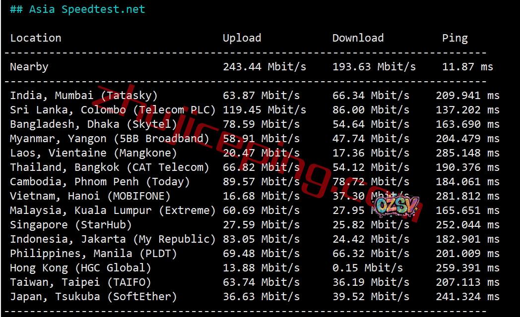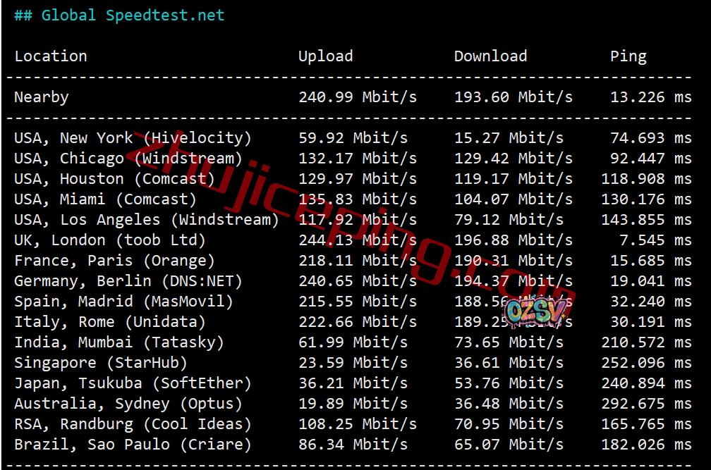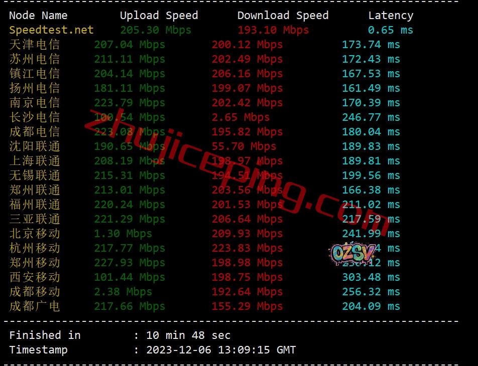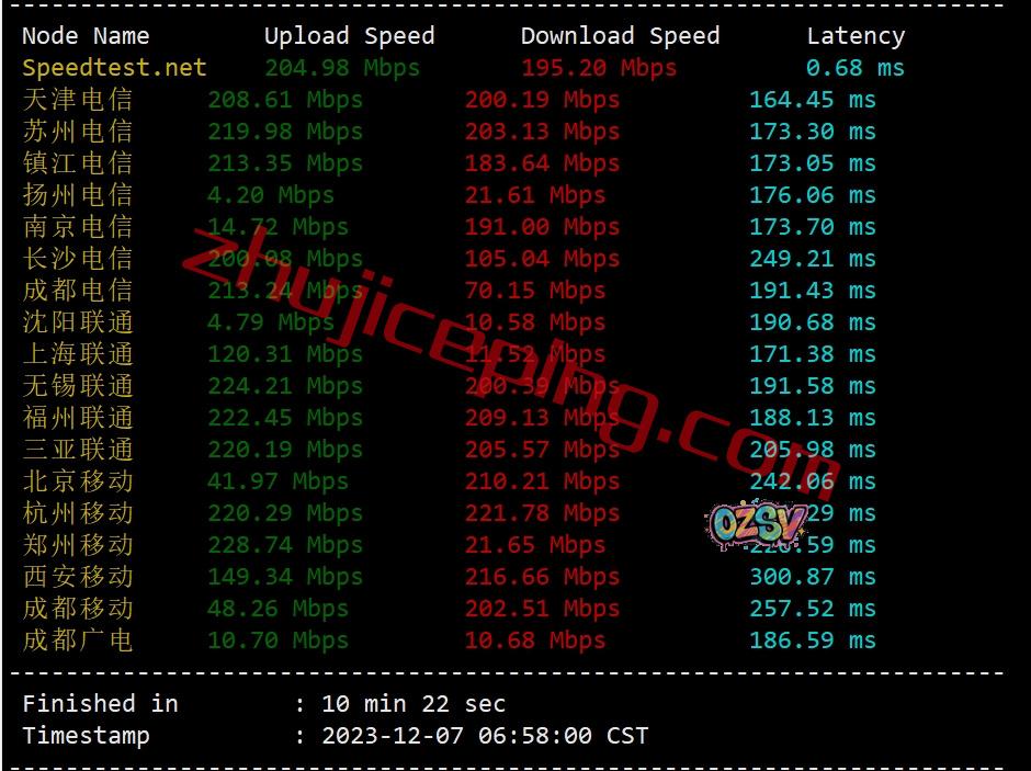 默认带宽为200Mbps,我们用speedtest在国内的三网节点跑一圈上下行带宽测试,大致数据如下: