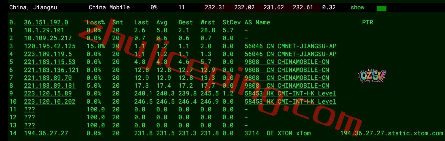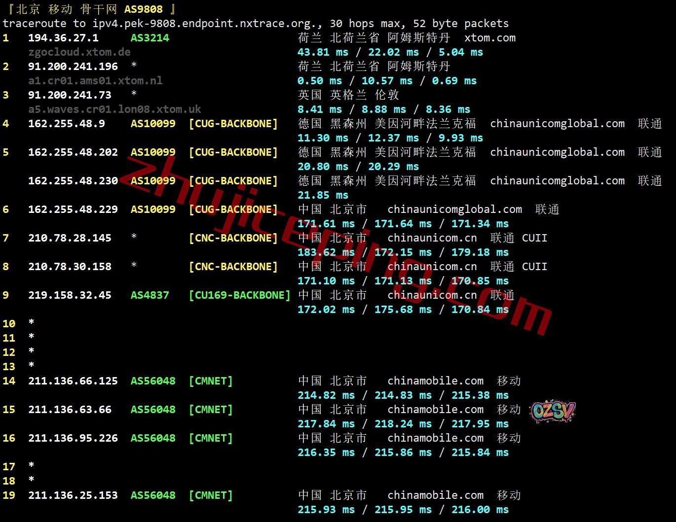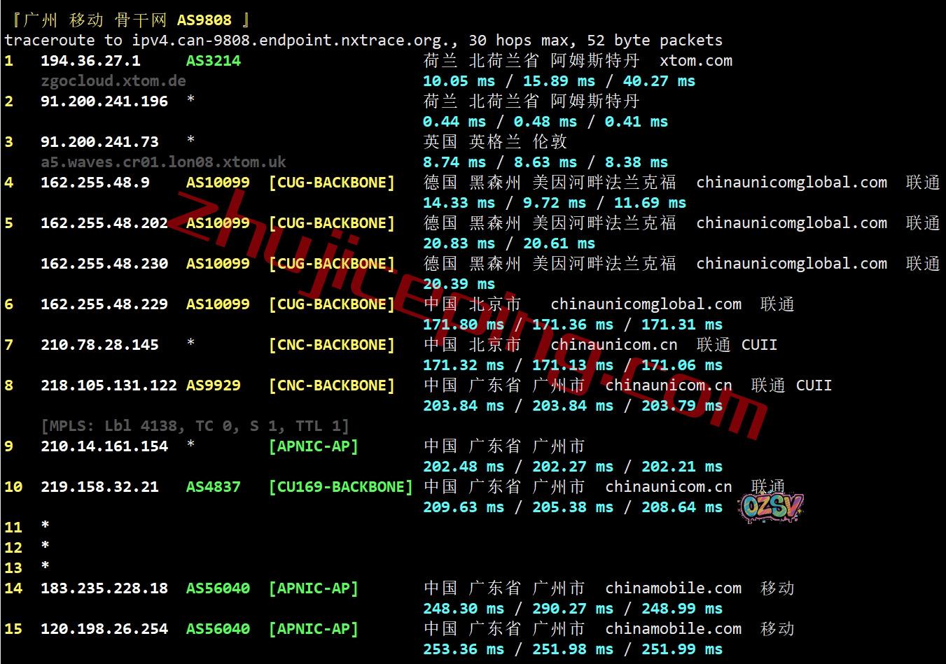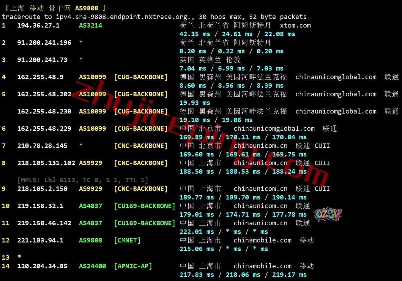 移动回程:与联通一样,强制走的是联通AS9929链路回国的