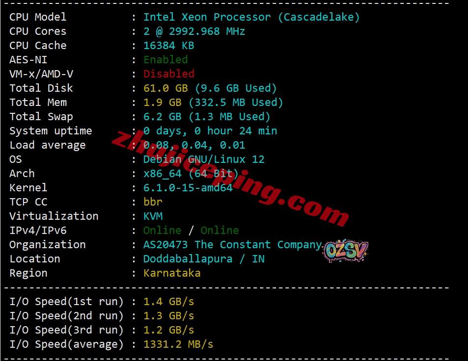 CPU型号未知主频大致3.0GHz,站长启用了BBR,IP支持V4和V6,归属印度地卡纳塔克邦,当前I/O大致1331MB/S: