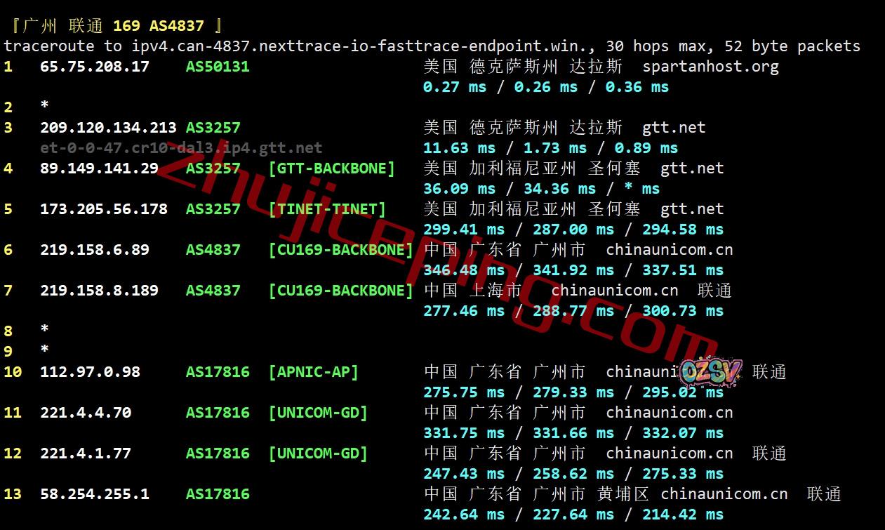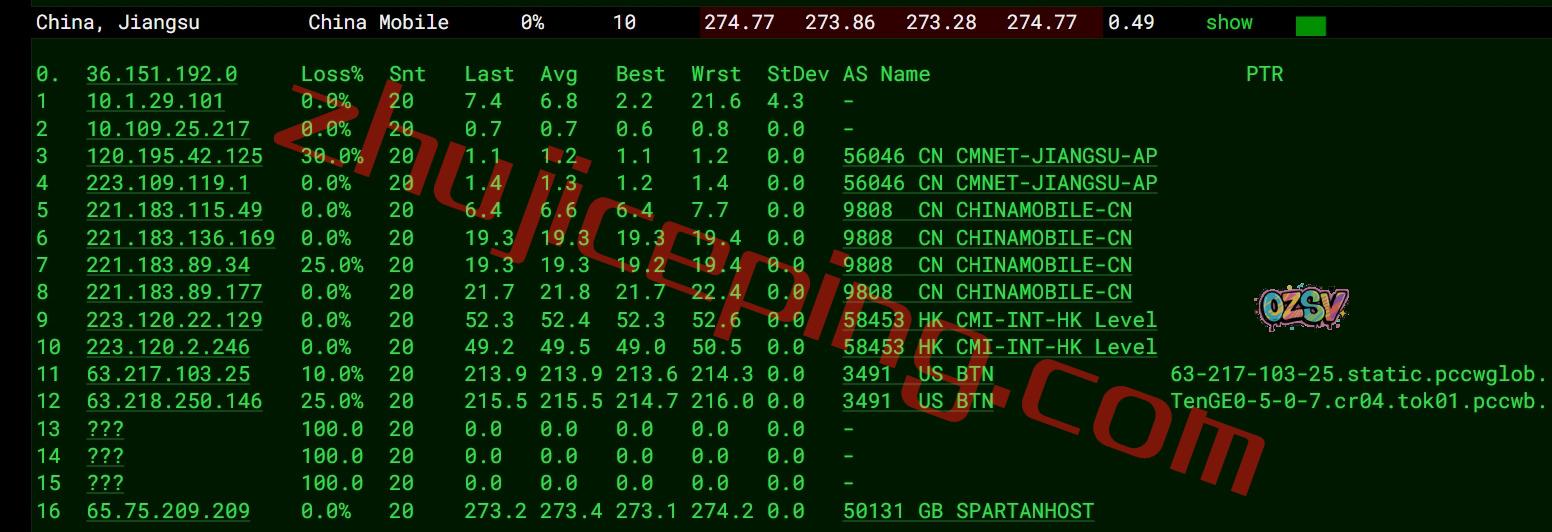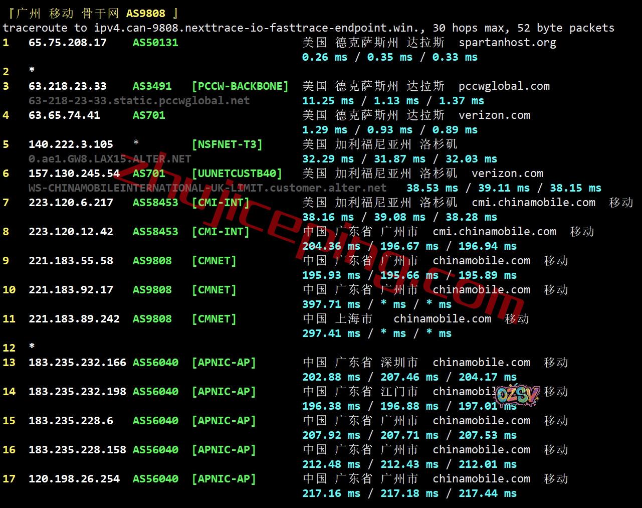 广州方向:走pccw经过Verizon到洛杉矶,从移动洛杉矶节点直接回国