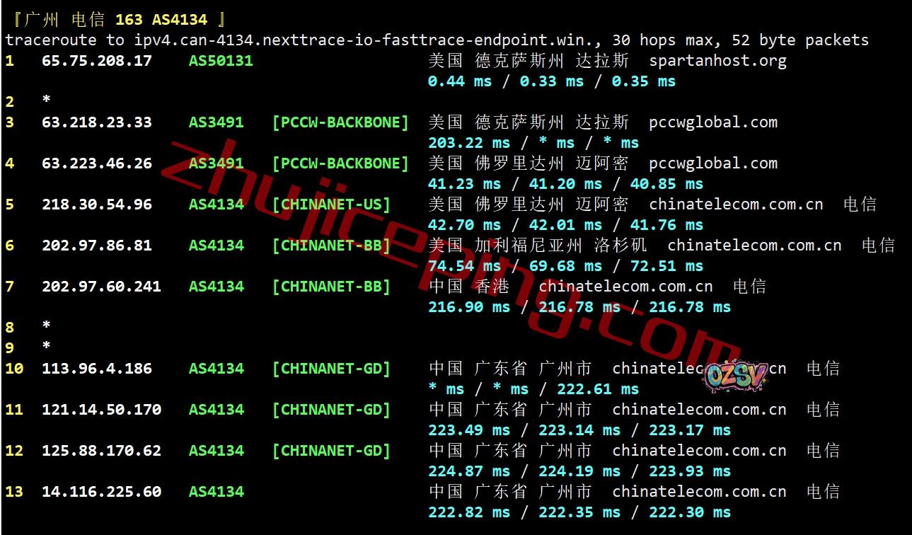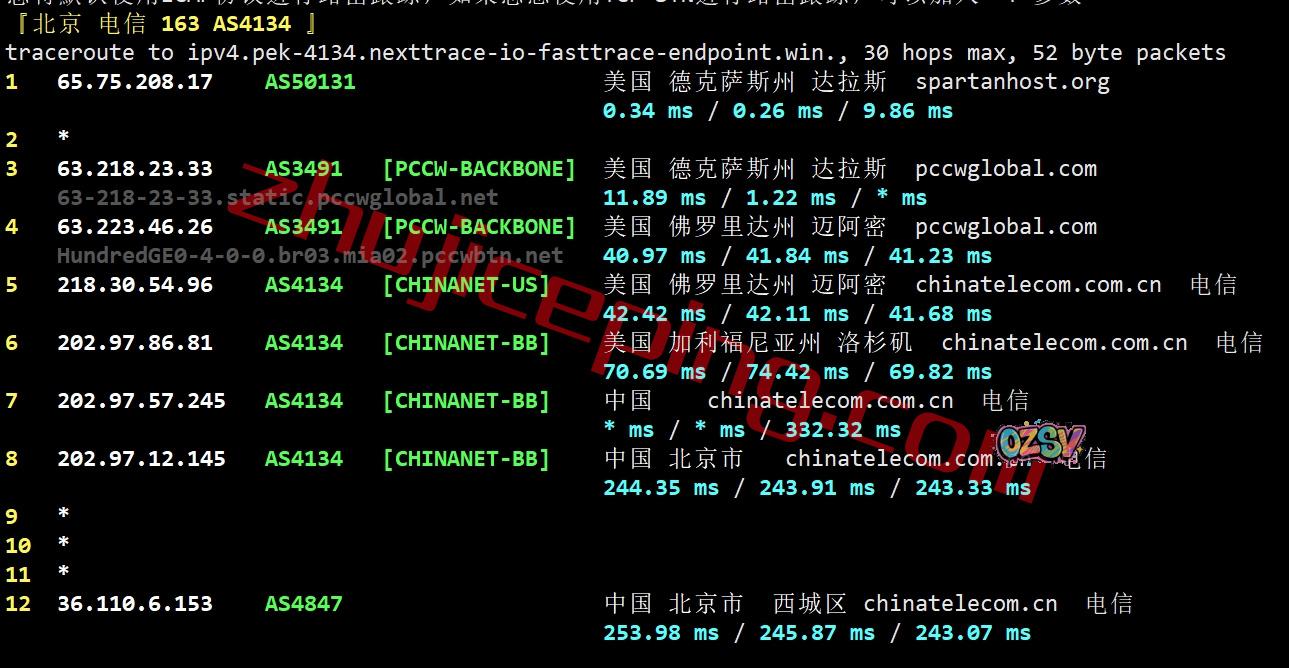 北京/广州方向:pccw接迈电信阿密节点,然后到电信洛杉矶节点,再从电信洛杉矶节点直接回国