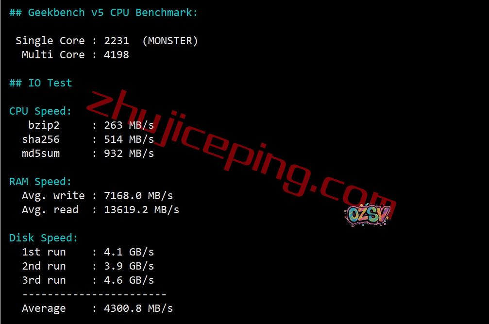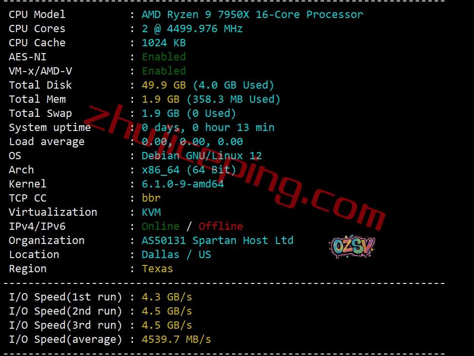 AMD Ryzen 9 7950X,Zen 4架构,16核、32线程、主频4.5GHz、加速频率5.7GHz,不支持IPv6(实际上是给了/48 IPv6的,站长没有研究),当前硬盘I/O大致在4539MB/S的样子: