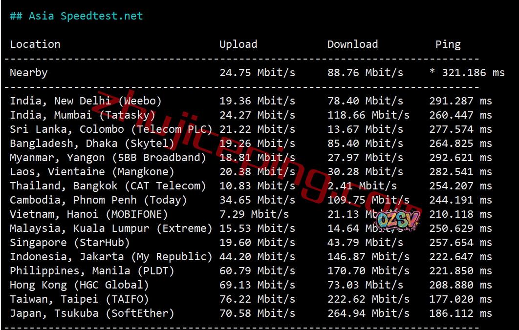 speedtest部分亚洲节点的数据:
