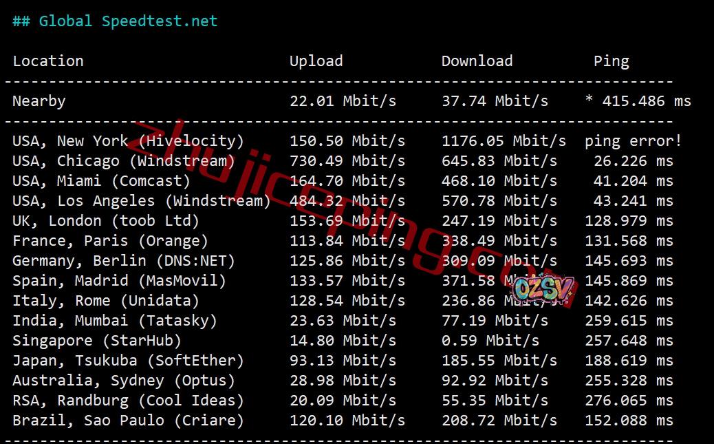 再看speedtest部分国际节点的数据: