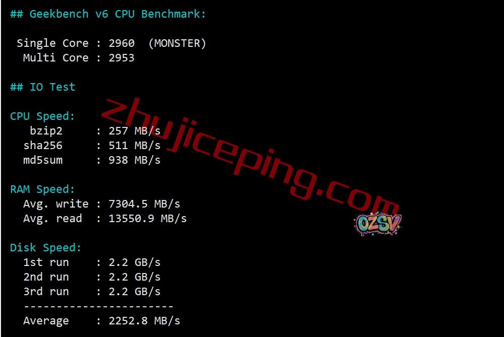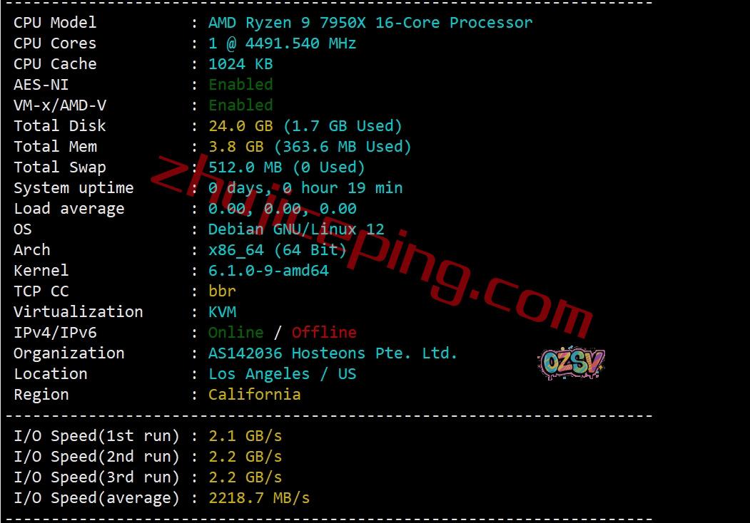 AMD Ryzen 9 7950X(Zen 4、16核、32线程、主频4.5GHz、加速5.7GHz)、洛杉矶默认没有开启V6(估计需要发工单),hosteons自家的AS,当前硬盘I/O大致在2218MB/S的样子: