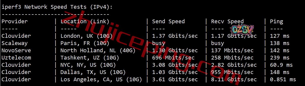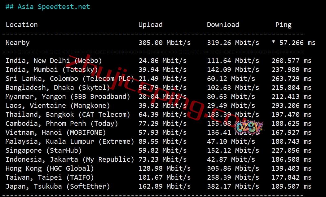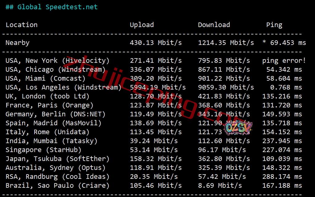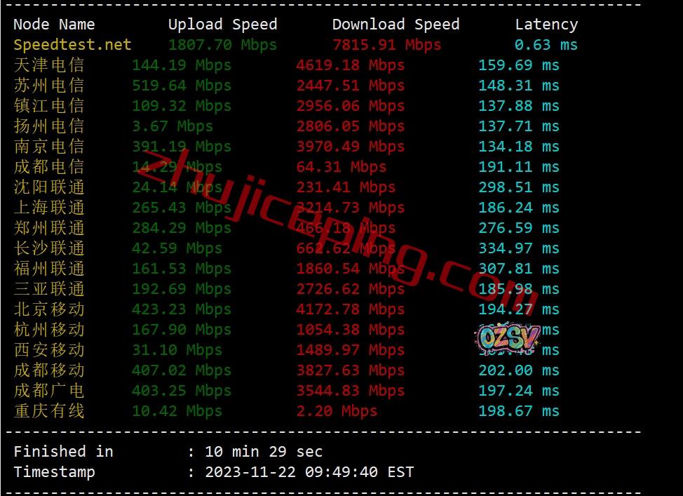 用speedtest在国内的三网多节点跑一圈上下行带宽测试,大致结果如下: