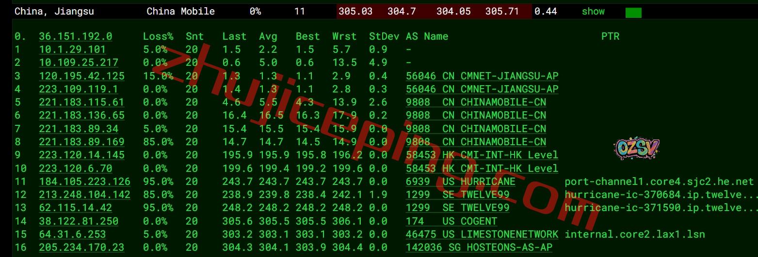 移动去程:直连移动洛杉矶节点,然后走HE.net接 twelve99再接cogent然后到机房