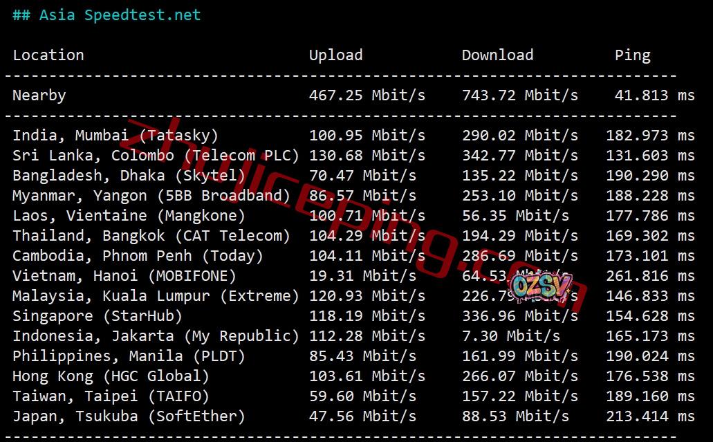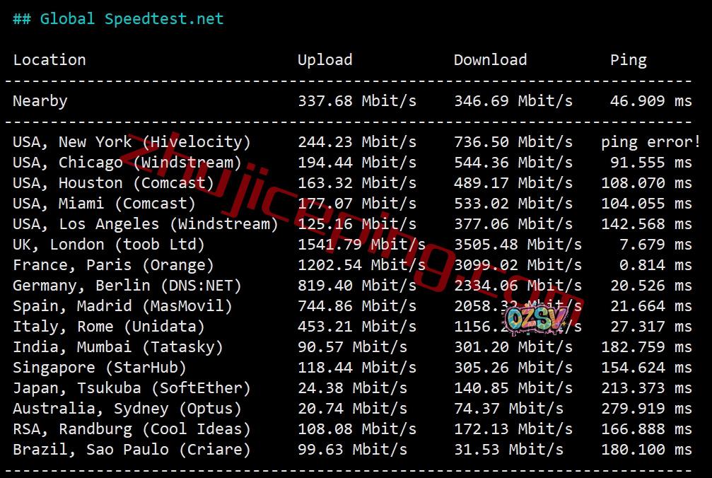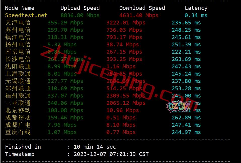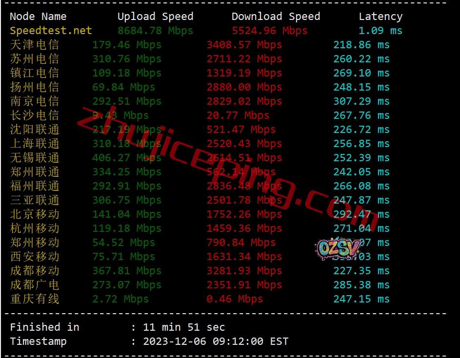 用speedtest的国内三网多节点跑一下带宽上下行测试,大致数据如下: