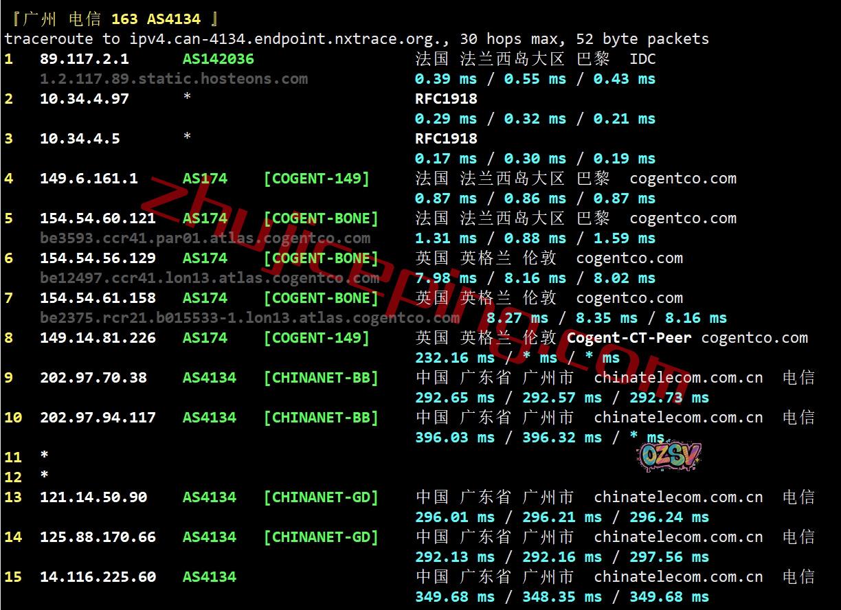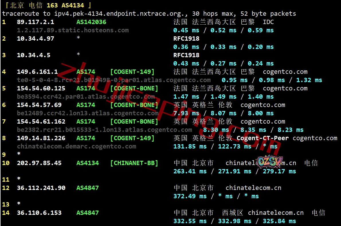 北京/广州方向:走cogent经过英国,从电信与cogent在伦敦的peer处直连回国