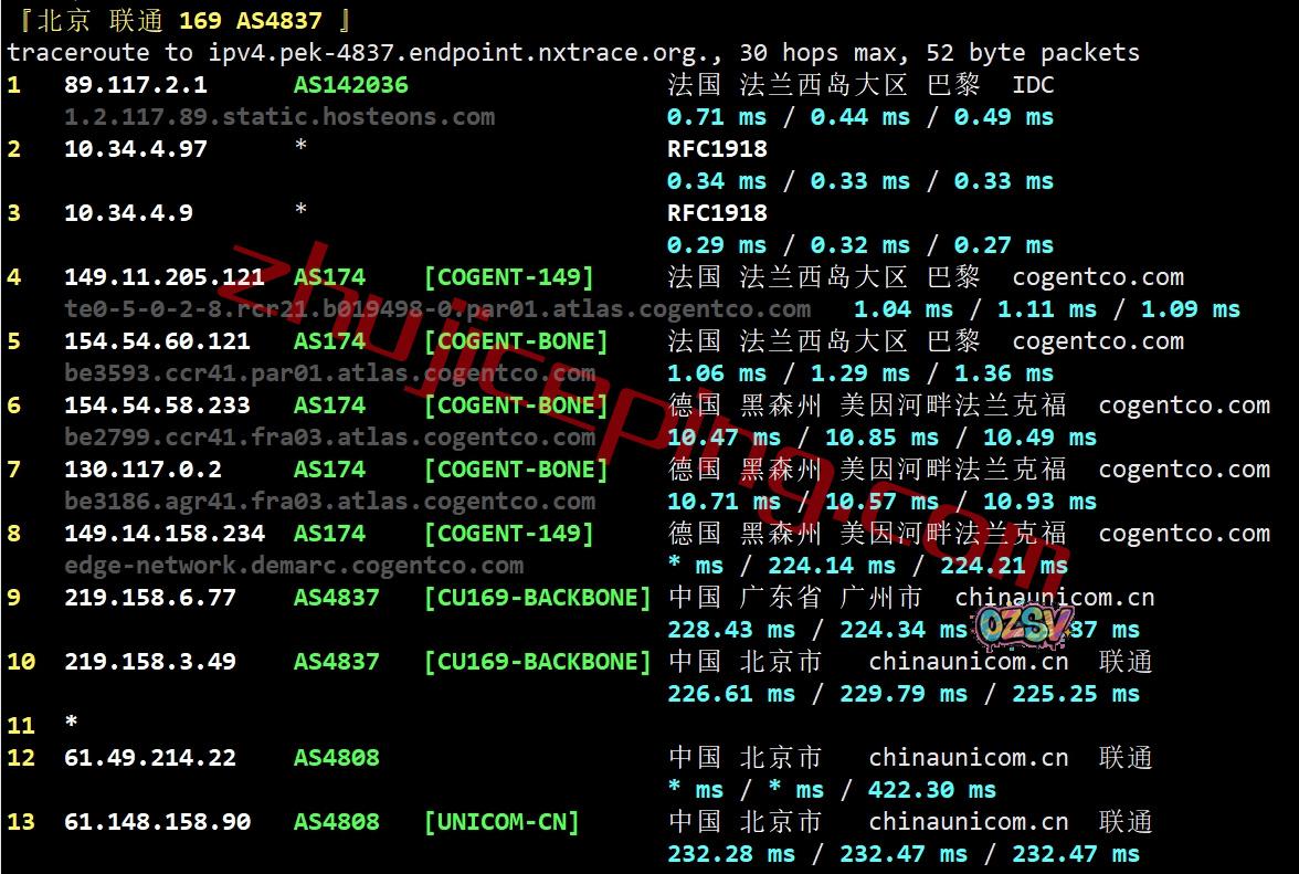 北京方向:走cogent经过德国,从法兰克福出海回国,纯国际线路