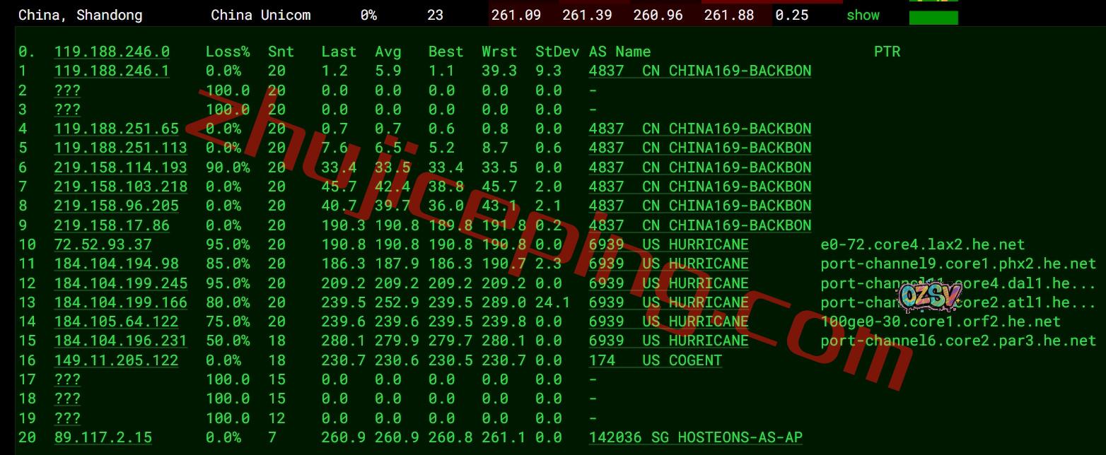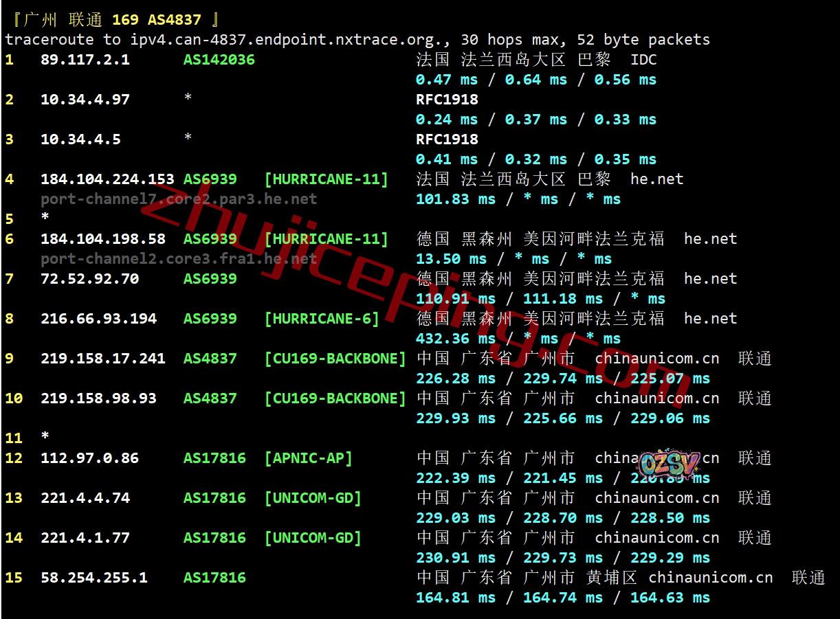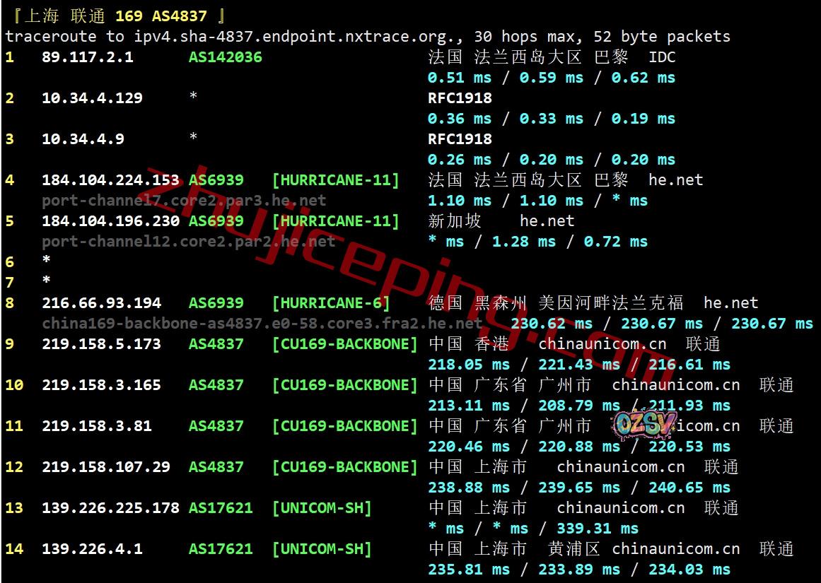 联通去程:直连联通洛杉矶节点,然后走HE.NET横穿美国从东海岸出海去法国