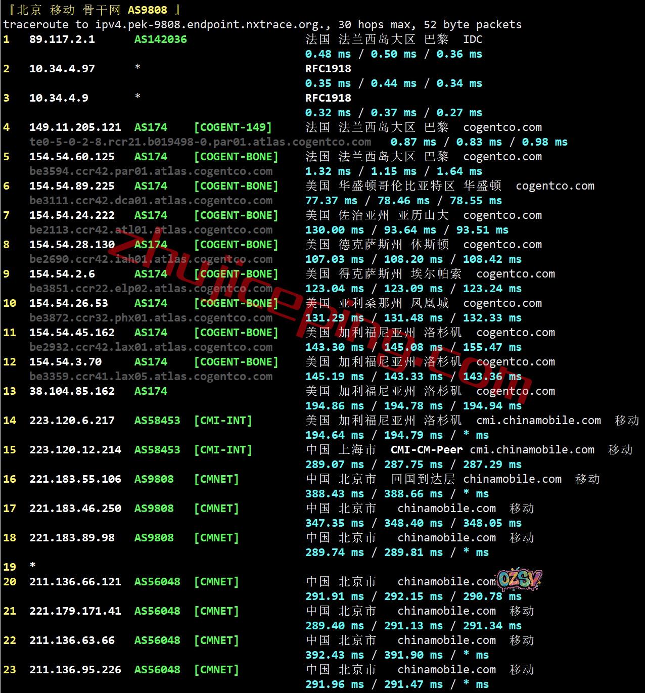 移动去程:直连移动伦敦节点然后走HE,NET、twelve99、cogent去法国