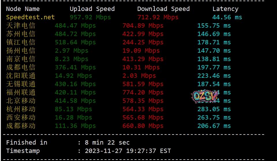 speedtest在国内三网的节点跑一圈上下行带宽测试,大致数据(白天测试的,那个EST比国内晚了13个小时):