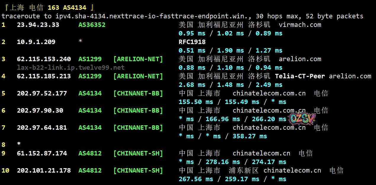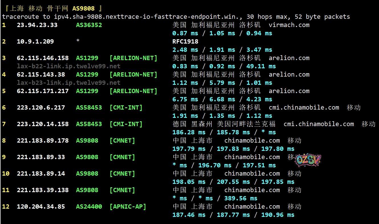 上海方向:twelve99接移动在洛杉矶的节点后直接去了移动在德国法兰克福的节点,再直连回国
