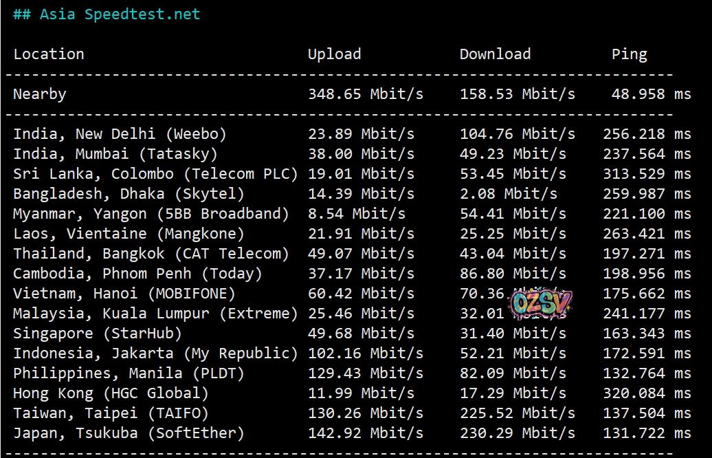 speedtest部分亚洲节点的测试数据: