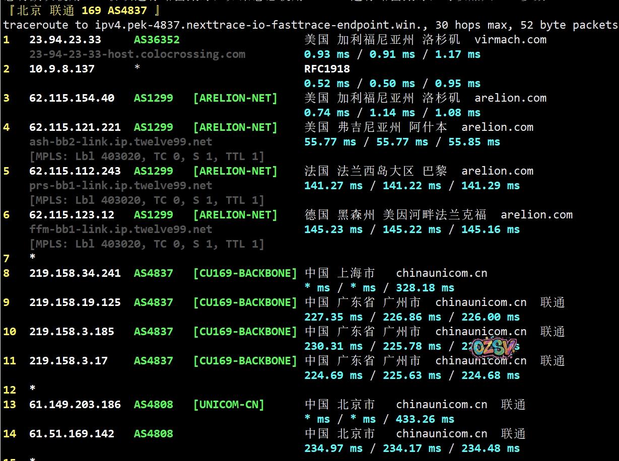 网络方面,电信的回程是直连,移动上海方向的回程跑了下德国剩下的也是直连,联通回程全部都是国际线路部分还绕了德国…