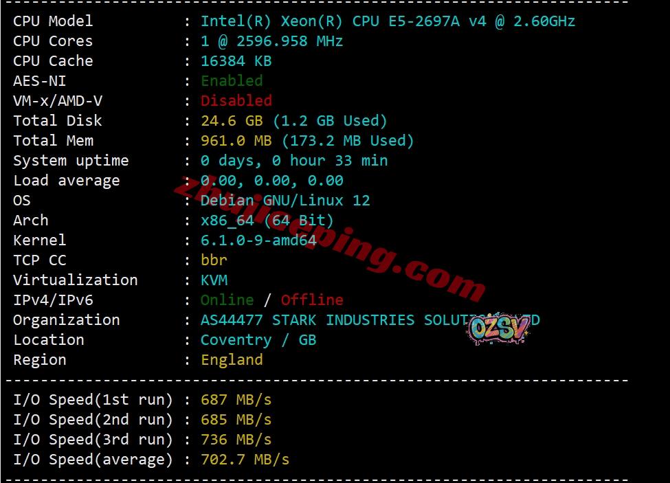 服务器用的CPU型号为E5-2697Av4(16核、32线程、2.6GHz主频、3.6GHz加速频率),站长启用了BBR,由于IPv6需要额外加1欧元这里没有选,AS44477实际就是the.hosting自己的,归属地为英国,当前I/O大致在702MB/s: