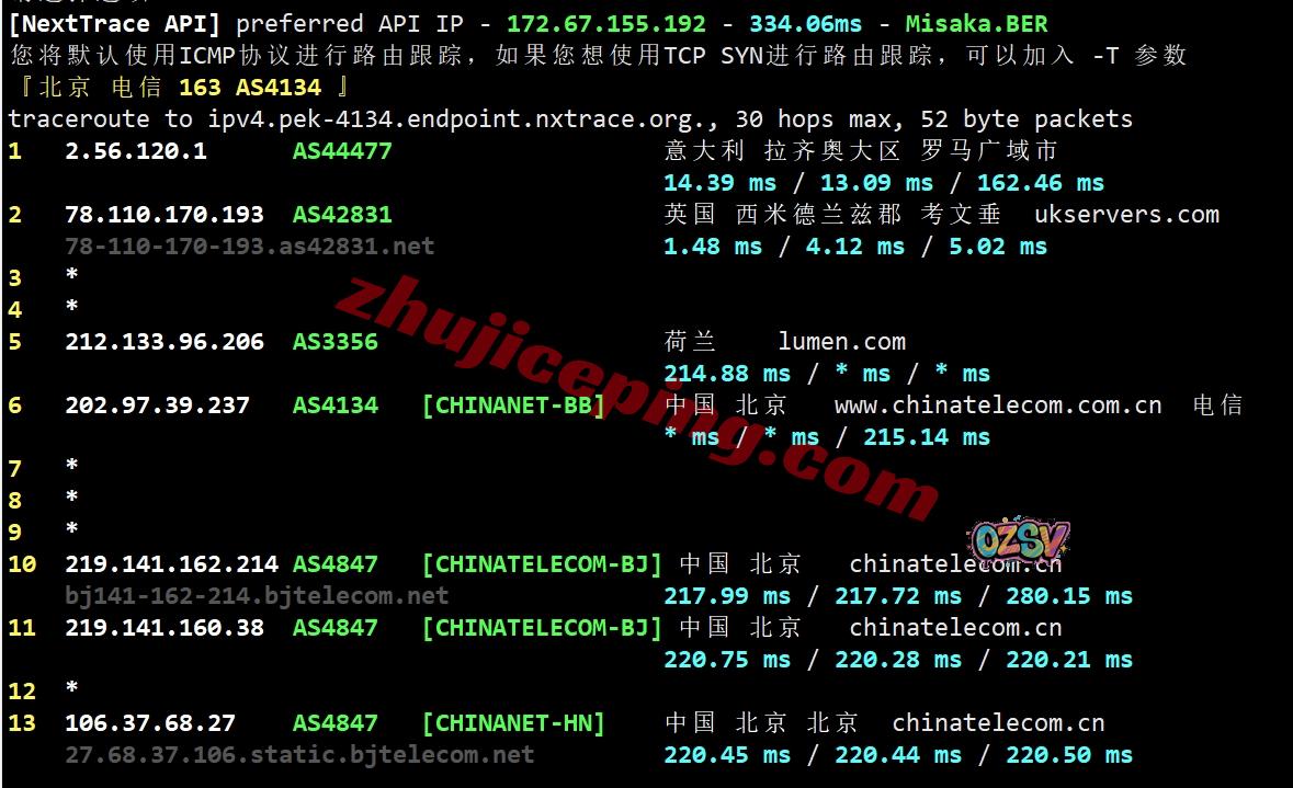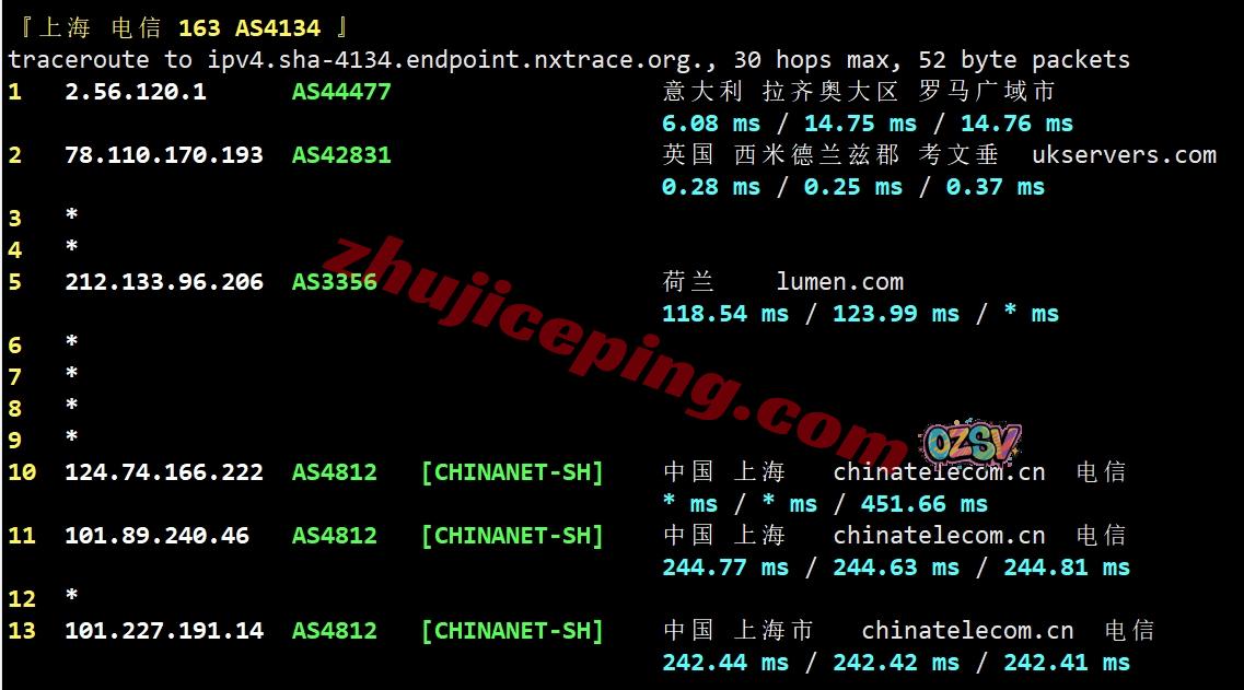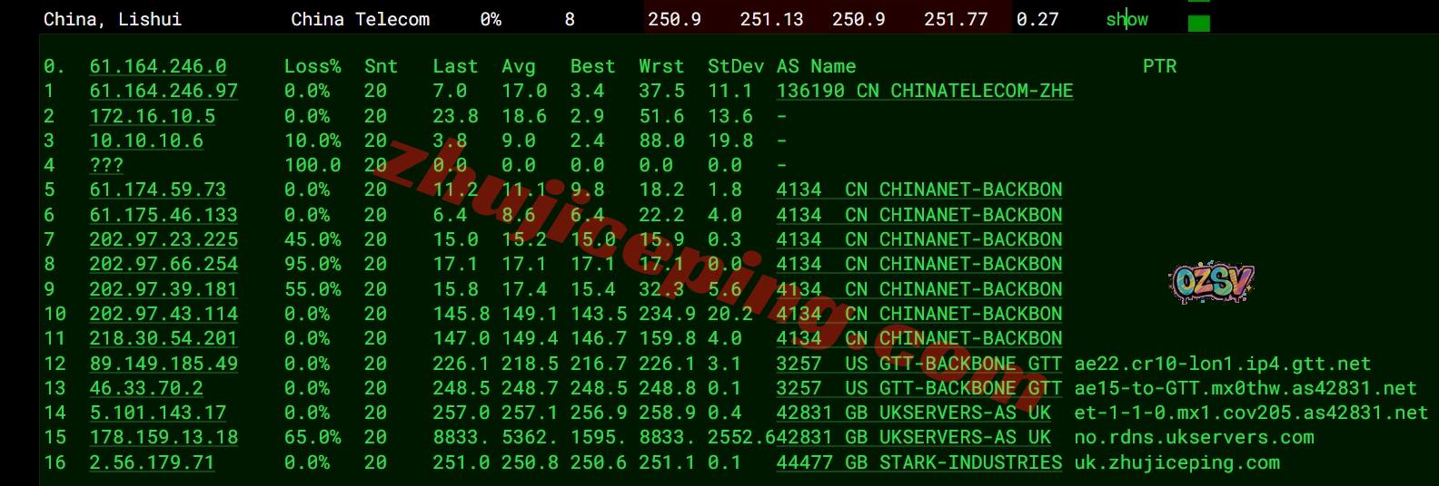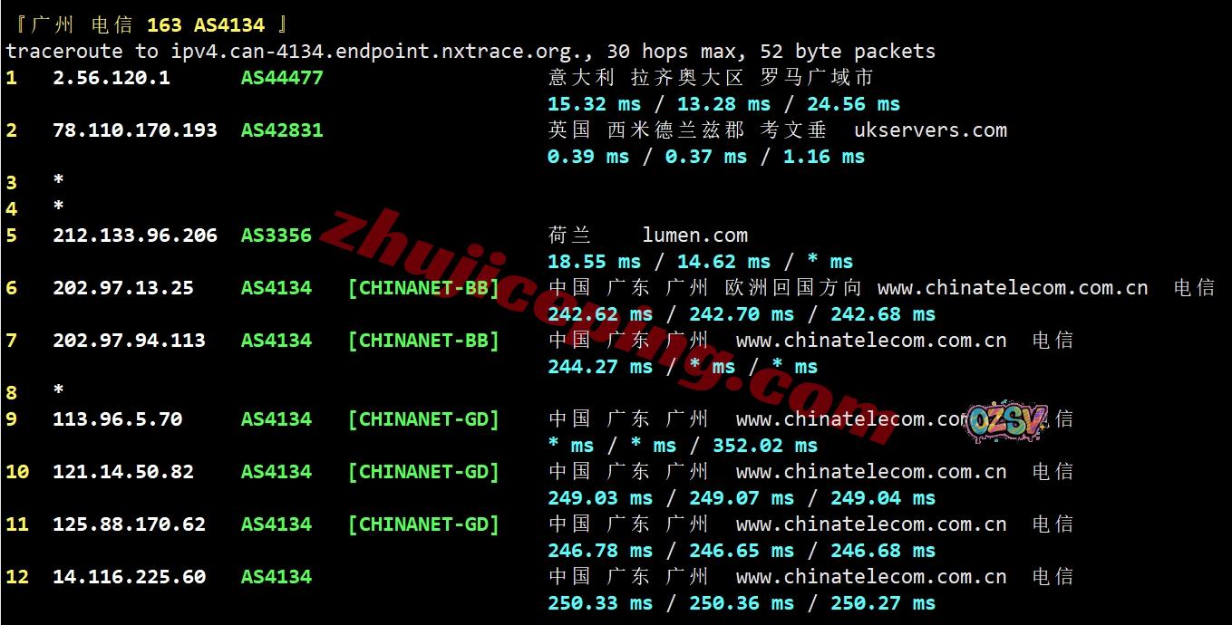 电信去程:直连电信美国圣何塞节点庵后接GTT去英国